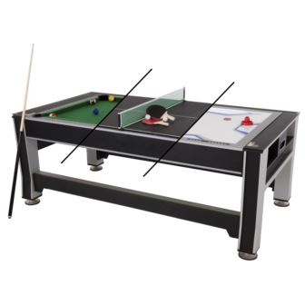 Rotate between three great games on one table in seconds. The Triumph 3-in-1 Swivel Multigame Table allows you to play three different games on one table using the rotating swivel design. The table measures 84 inch L x 44.5 inch W x 32 inch H, construction giving you a full-size table that the whole family will enjoy. The table comes ready to play with all of the accessories to play all three games included. The fun never stops with three challenging games in one quality Triumph table!
