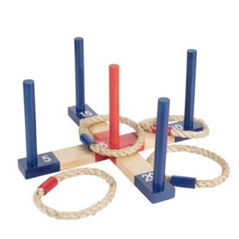 Compact and portable, the Triumph Wood Ring Toss Set assembles in seconds by tightly securing each peg to the stackable base. Perfect for a backyard barbecue or at the beach, the set includes two red and two blue rope toss rings and one wood 5 peg ring toss target with each peg awarding different points. Score 5, 10, 15, or 20 points for the outer rings and 25 points for the center ring.