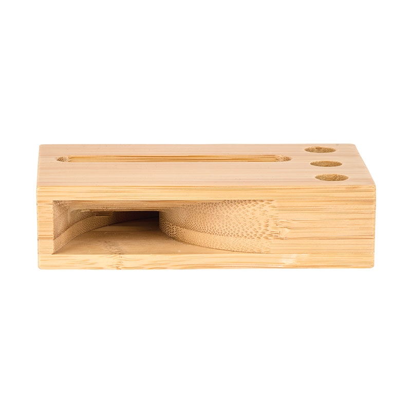 Elevate your space with the eco-conscious, multipurpose Allegra Phone Holder Amplifier crafted from 100% natural bamboo. This beautifully designed piece not only holds your phone and amplifies its sound, it also features three dedicated pen holes, making it a practical addition to any work or leisure space. Its smooth finish offers a touch of elegance, and the sustainable bamboo construction provides durability and a natural look. Perfect for hands-free viewing, it brings an organized, minimalist vibe to your desk, countertop, or vanity, all while naturally amplifying your favorite tunes. Its 3 3/8" x 1/2" Phone slot fits most standard size phones.