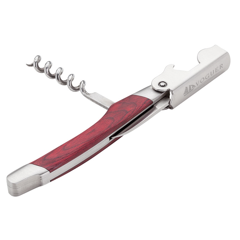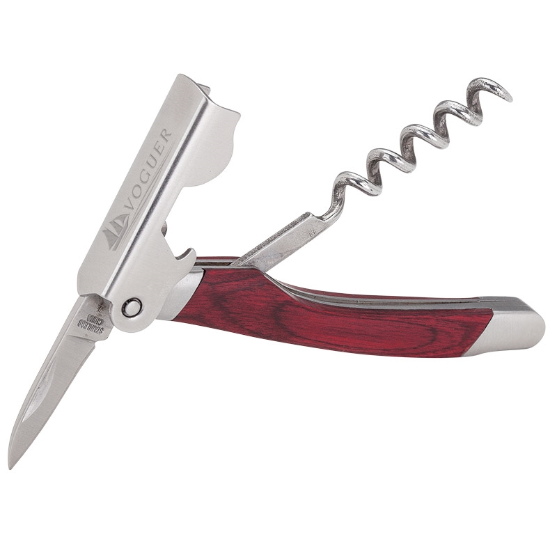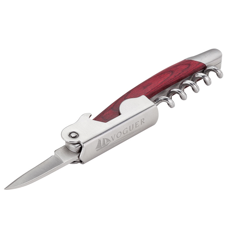 This bar tool has corkscrew, knife / foil cutter, bottle opener with a rich wood inlaid handle.