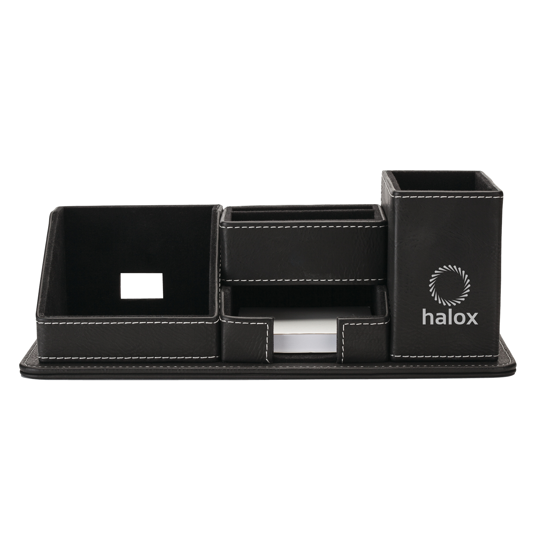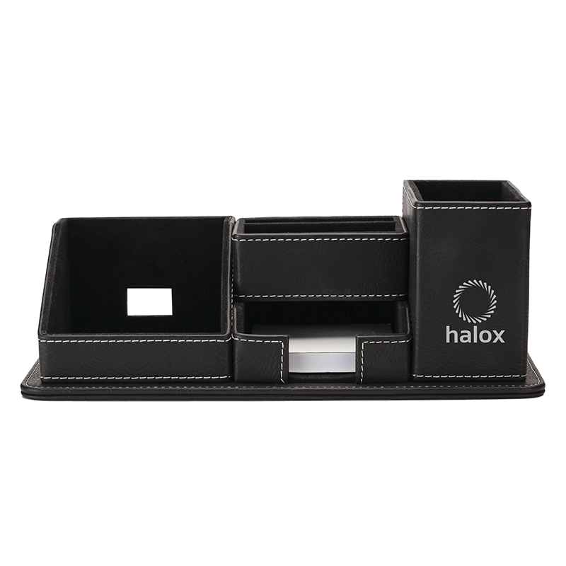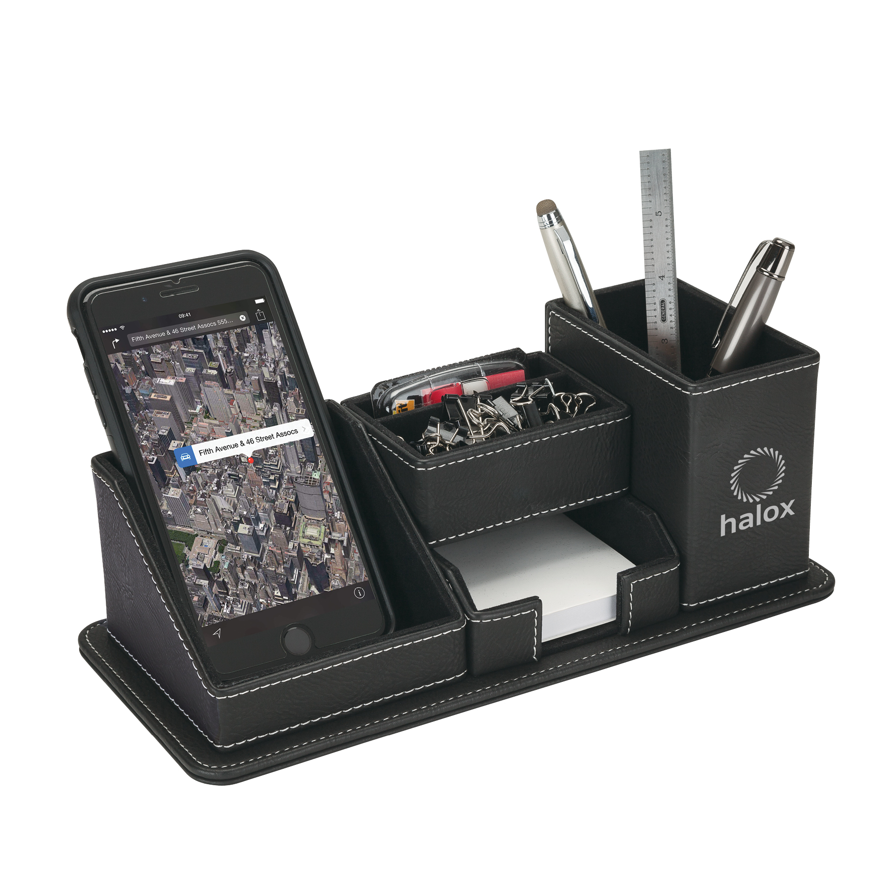 The Oxford executive desk organizer is stylish, yet functional, with a pen holder, 2 paper clip/accessory compartments, and a 100-page memo pad. It also includes a 3.5" wide spot for your phone with an integrated cut out to run your charging cord through and features white contrast stitching running along the edges.