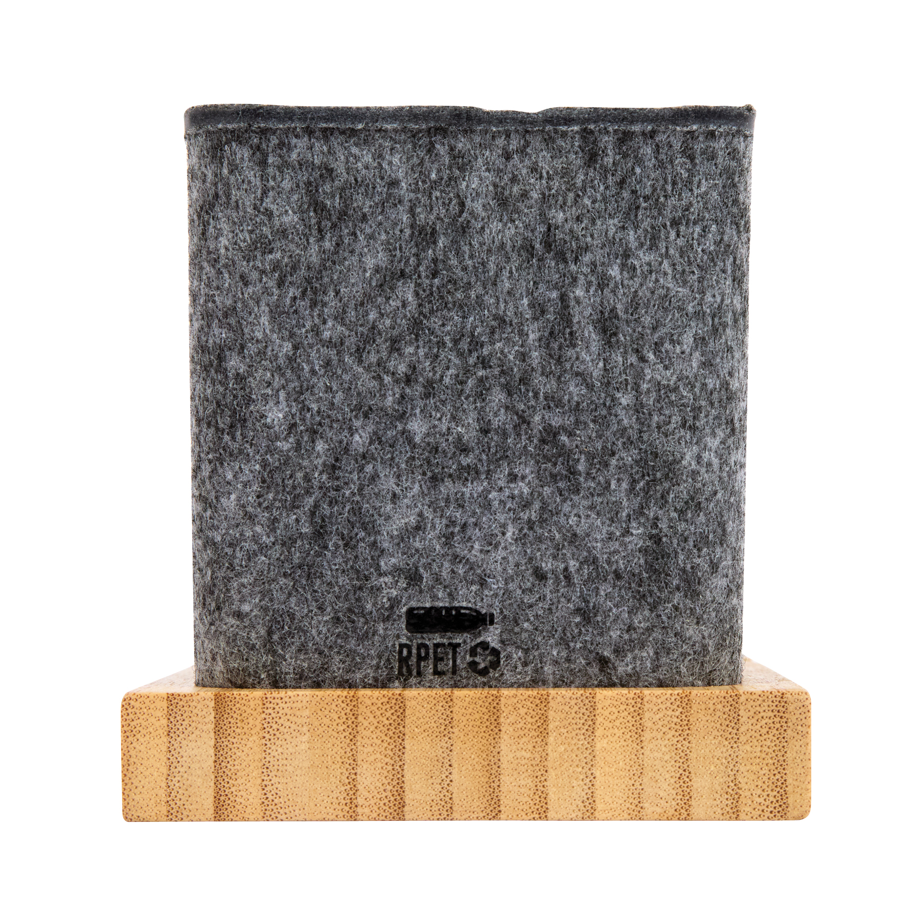 Stay organized and earth conscious with the Renton Desktop Pen & Device Holder. With a molded felt pen holder made from recycled plastic bottles (RPET), it offers a sustainable solution for storing your pens and other small items. The base is crafted from natural bamboo and functions as a convenient phone or business card stand, making it an ideal addition to any desk or workspace. Combine sustainability, natural elements and functionality with this thoughtfully crafted pen holder.