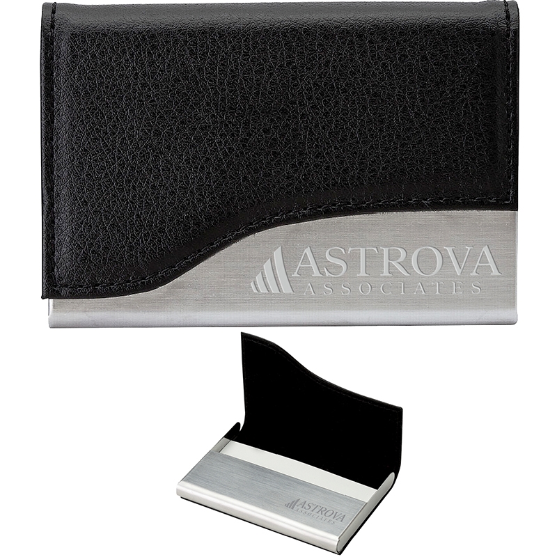Steel business card case with curved leatherette magnetic hinged cover.