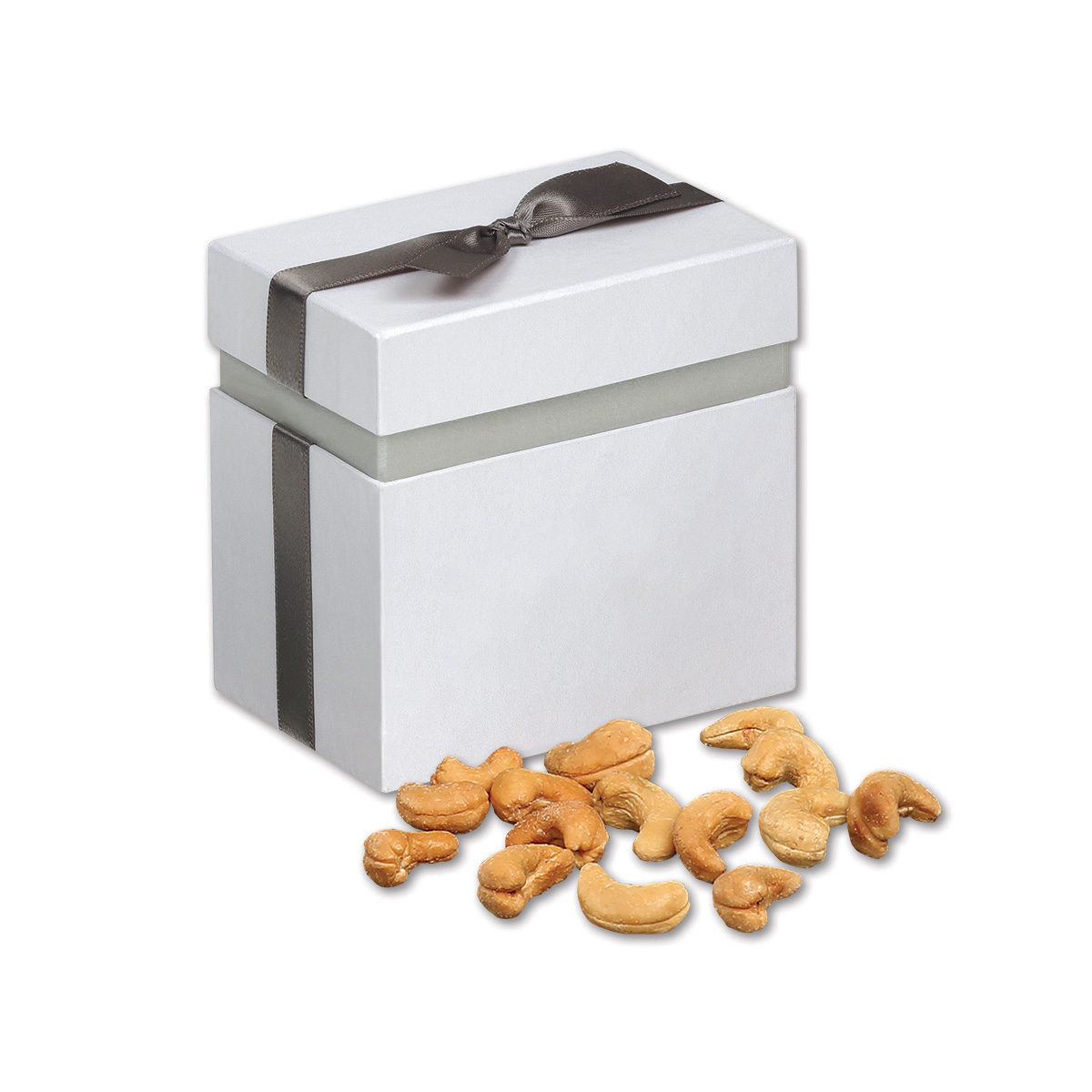 These jumbo, great tasting, freshly roasted, extra fancy cashews are some of the very finest in the world. We roast them carefully to make sure they are extra crunchy, then lightly salt them to bring out that real, honest-to-goodness flavor. Cashews are a great source of magnesium, selenium, zinc and iron. Each box contains five-ounces. The shimmering white gift boxes are complete with a pewter ribbon and foil-stamped on the front with your logo in silver. Contents: Fancy Cashews, 5 oz.