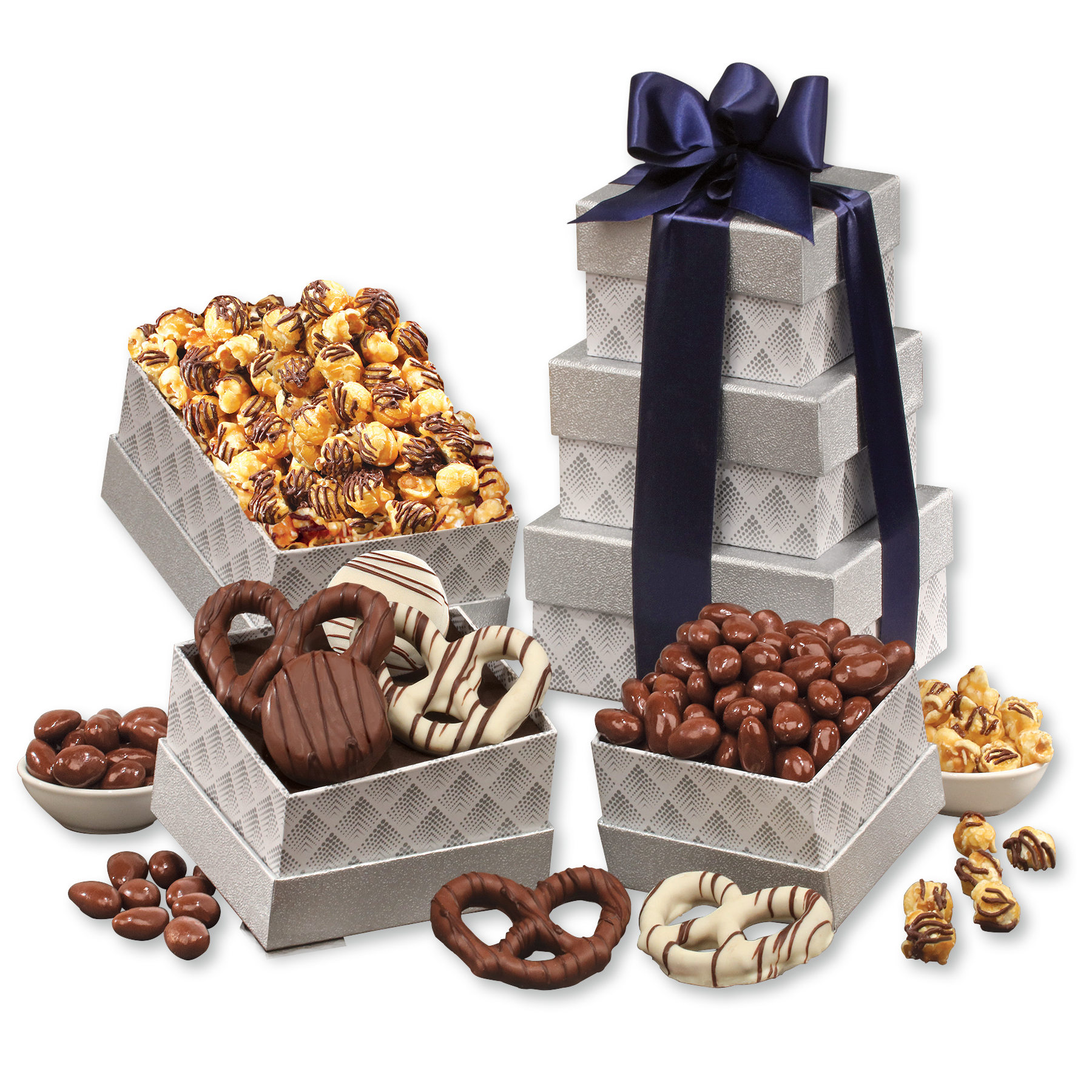 Everything is made better with a coating of rich chocolate, as this sophisticated tower proves! Five chocolate-covered treats fill the diamond-patterned boxes. The ribbon in your choice of color is foil-stamped with your imprint in silver to ensure they'll know who to thank for this stellar gift. Contents: Milk Chocolate Almonds, 5 oz. 2 Chocolate Dipped Pretzels, .8 oz. each Chocolate Covered Oreo Cookie, 1 oz. Chocolate Covered Graham, 1 oz. Chocolate Sea Salt Caramel Corn.