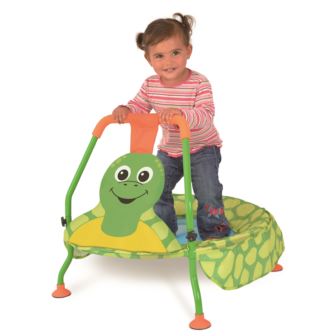 New improved cover design with friendly tortoise character. Ideal first trampoline for toddlers and young children with an easy grip handle to hold. Develops a young child's confidence as well as encouraging coordination and balance. Suitable for both indoor and outdoor use. Durable tubular steel frame, weatherproof padded mat and rubber feet. Handle and legs detach for ease of storage. Adult assembly required; detailed assembly instructions included.