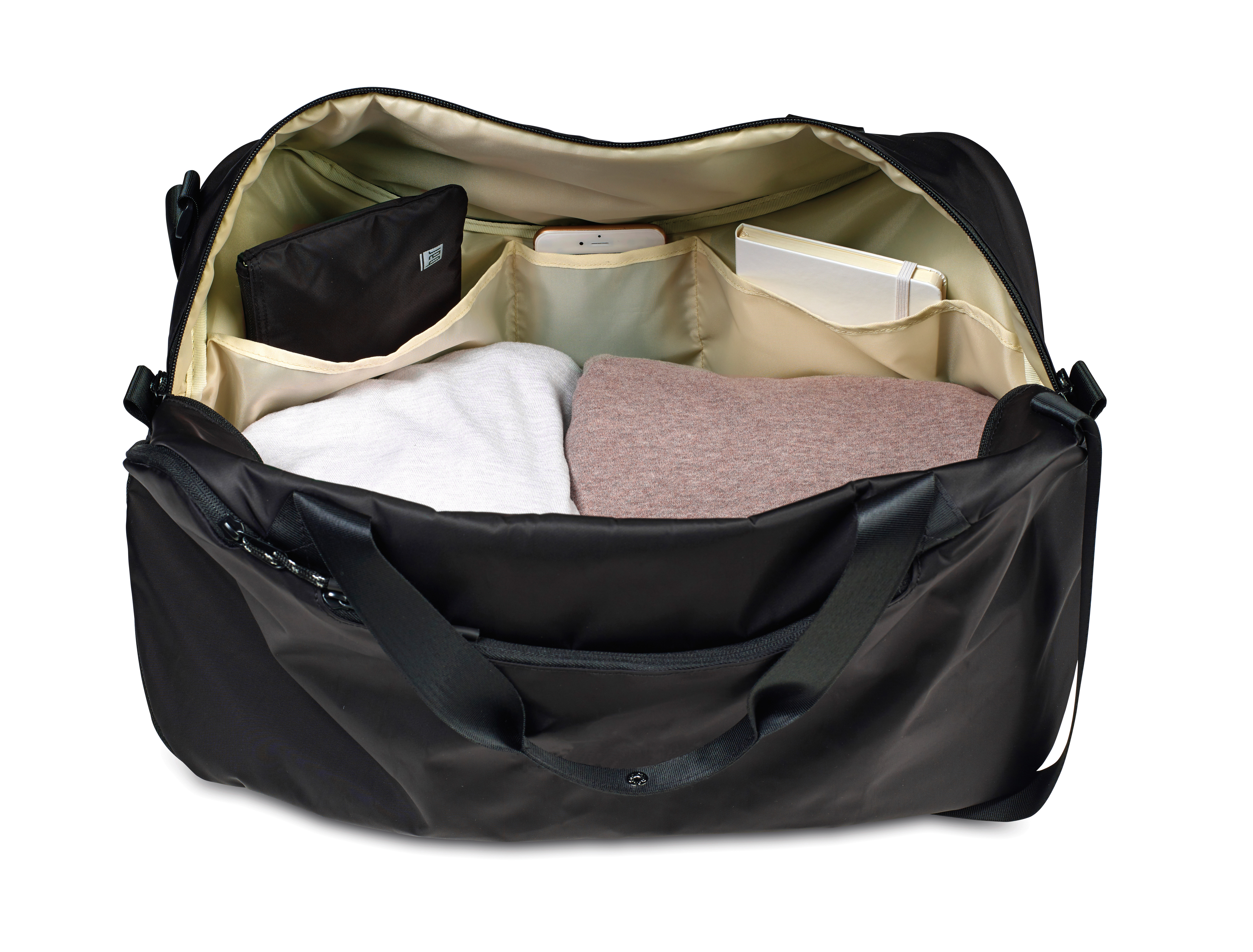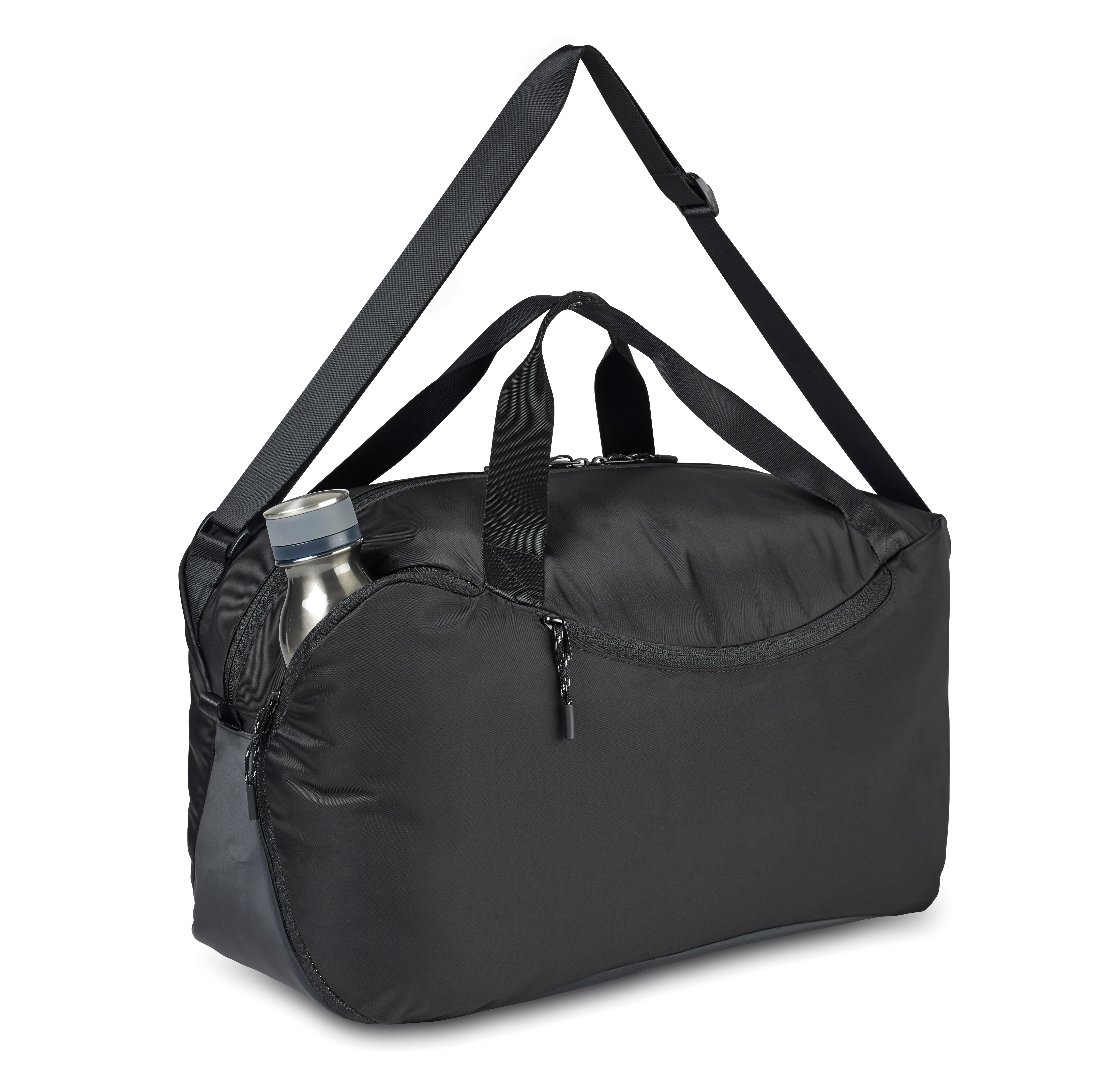 Perfect for your next yoga or barre class. Dual zippered opening to large main compartment. Side zippered water bottle pocket is sleek and easily zips away. Interior slash pockets for extra organization of essentials. Includes removable zippered pouch with carry handle for easy grab and go of must haves. Front zippered pocket for additional storage. Adjustable shoulder strap. Top grab handles.