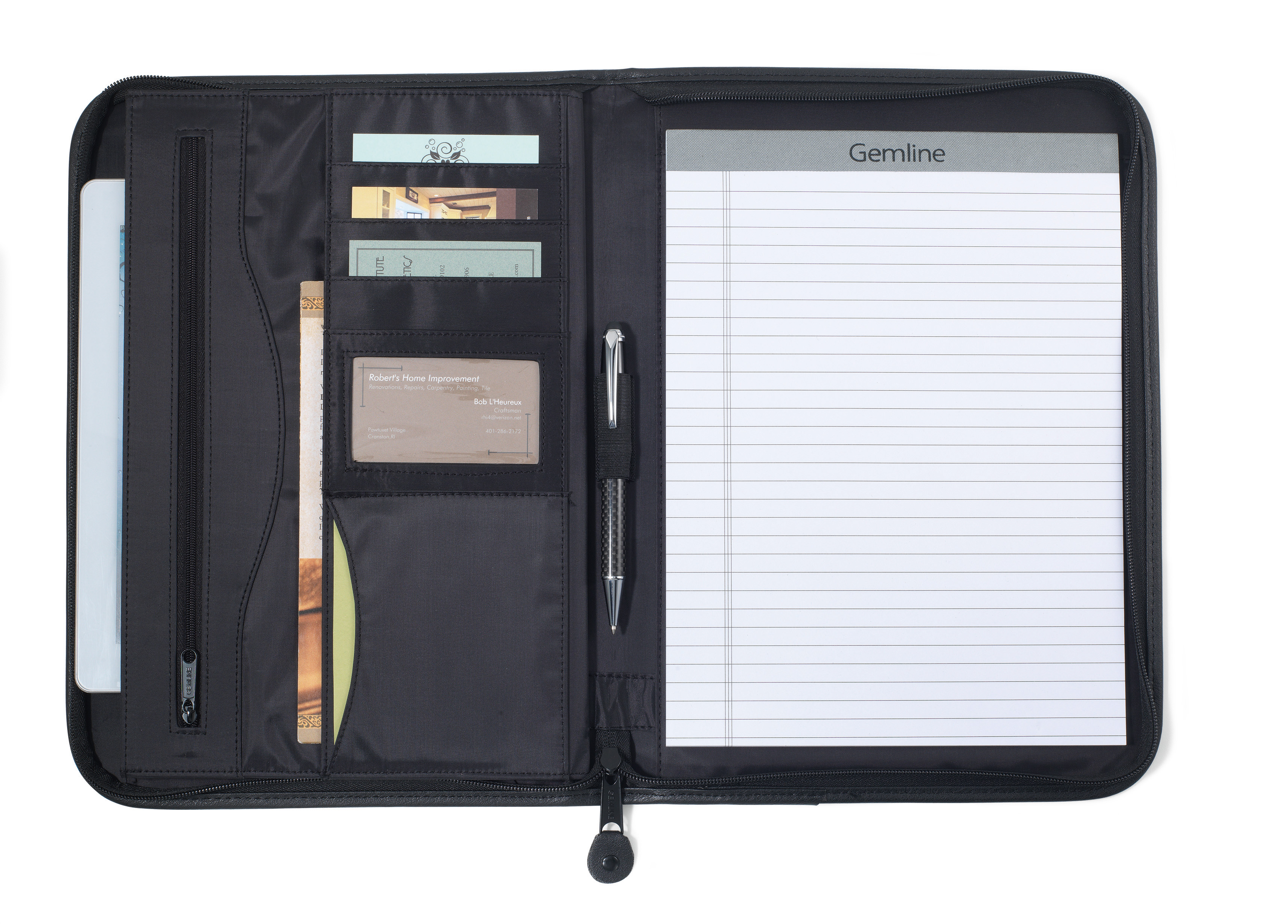 Become an advertising leader with the deluxe executive padfolio! Made of simulated leather, this appealing padfolio features a curved exterior pocket, zippered closure, multi-pocket organizer with a zippered closure, slash pocket that fits most tablets, pen loop and 8 1/2 x 11 paper pad. This professional favor also accommodates an A4 paper pad and is great for any event. Have your logo debossed or silkscreened to raise brand awareness today!