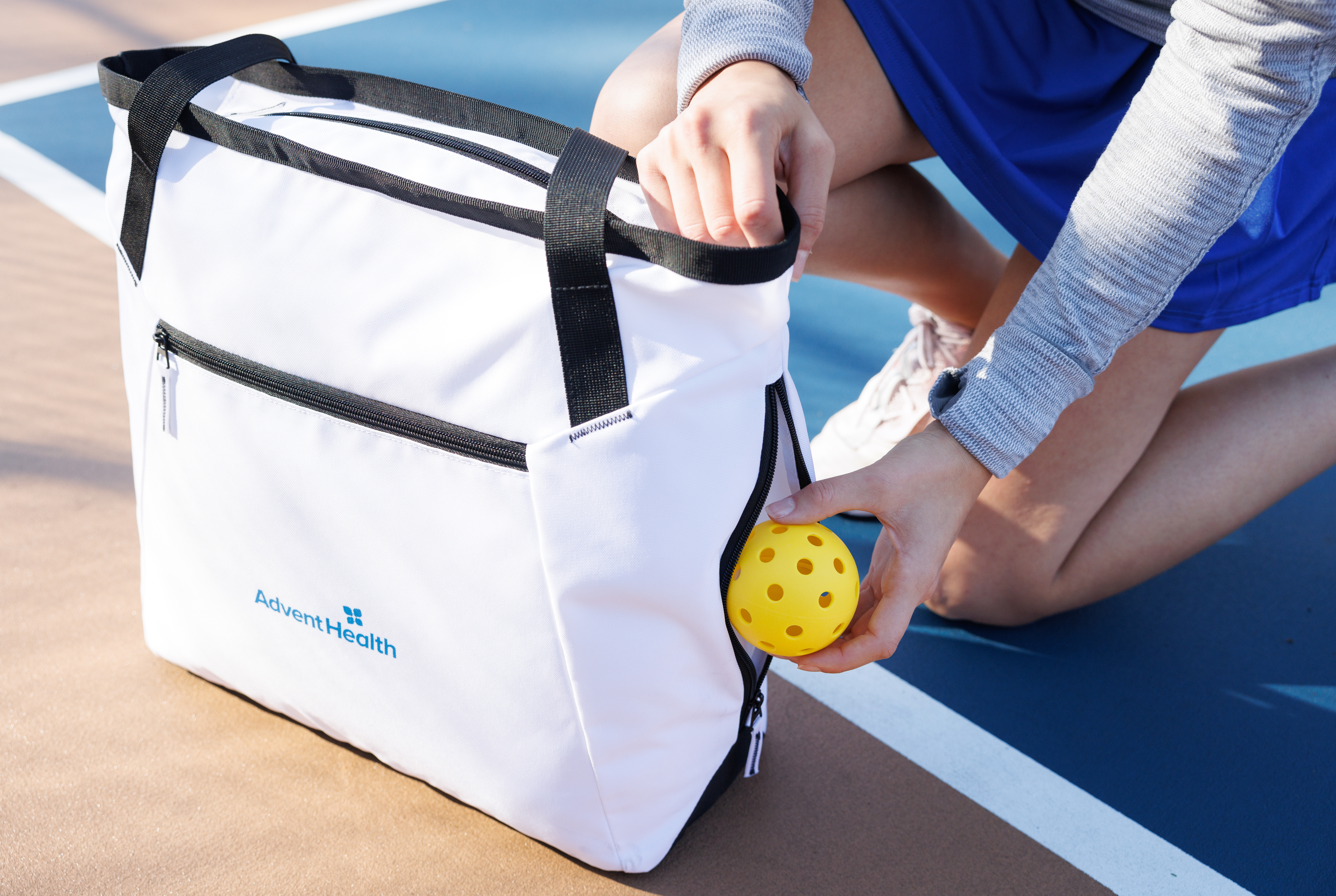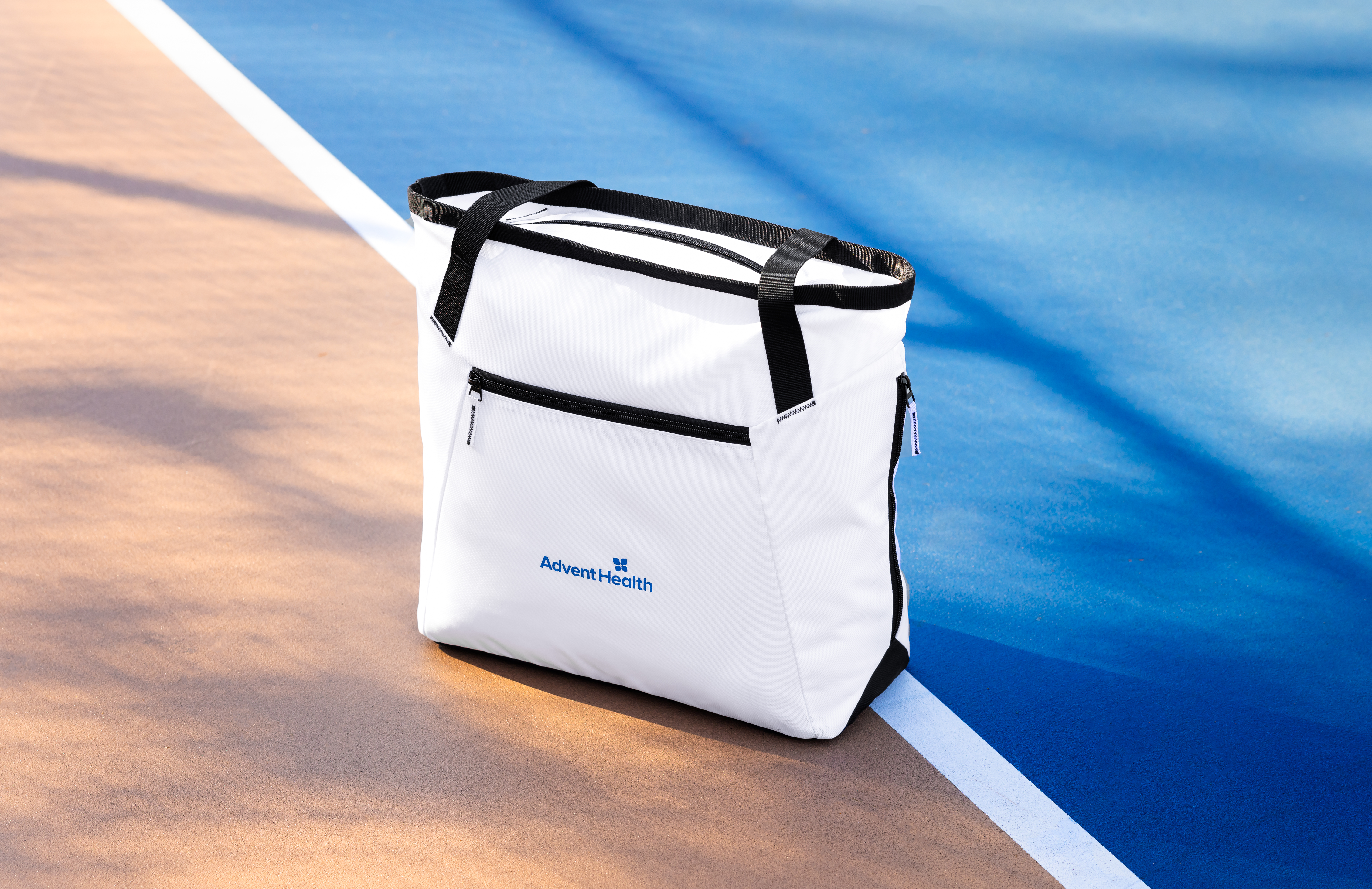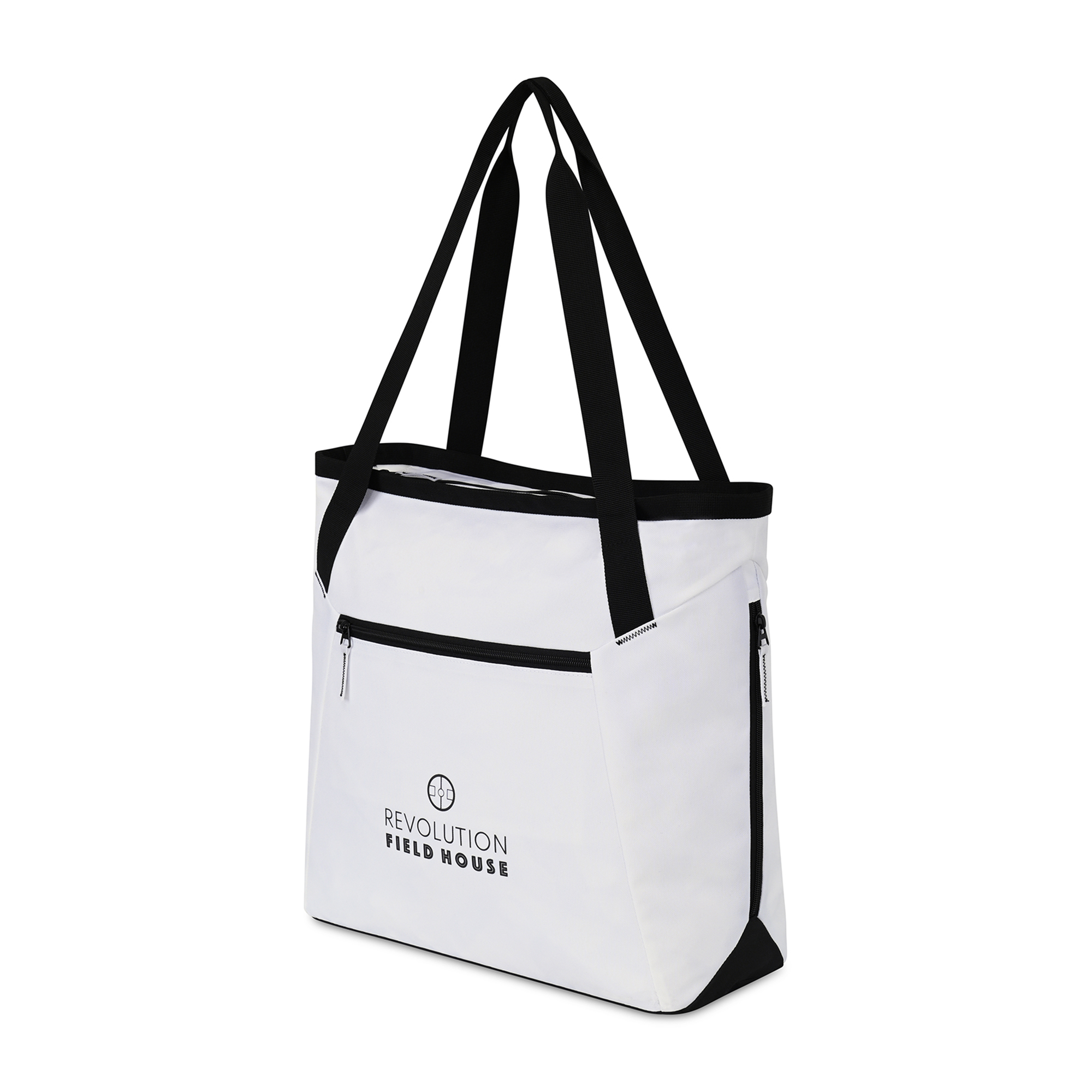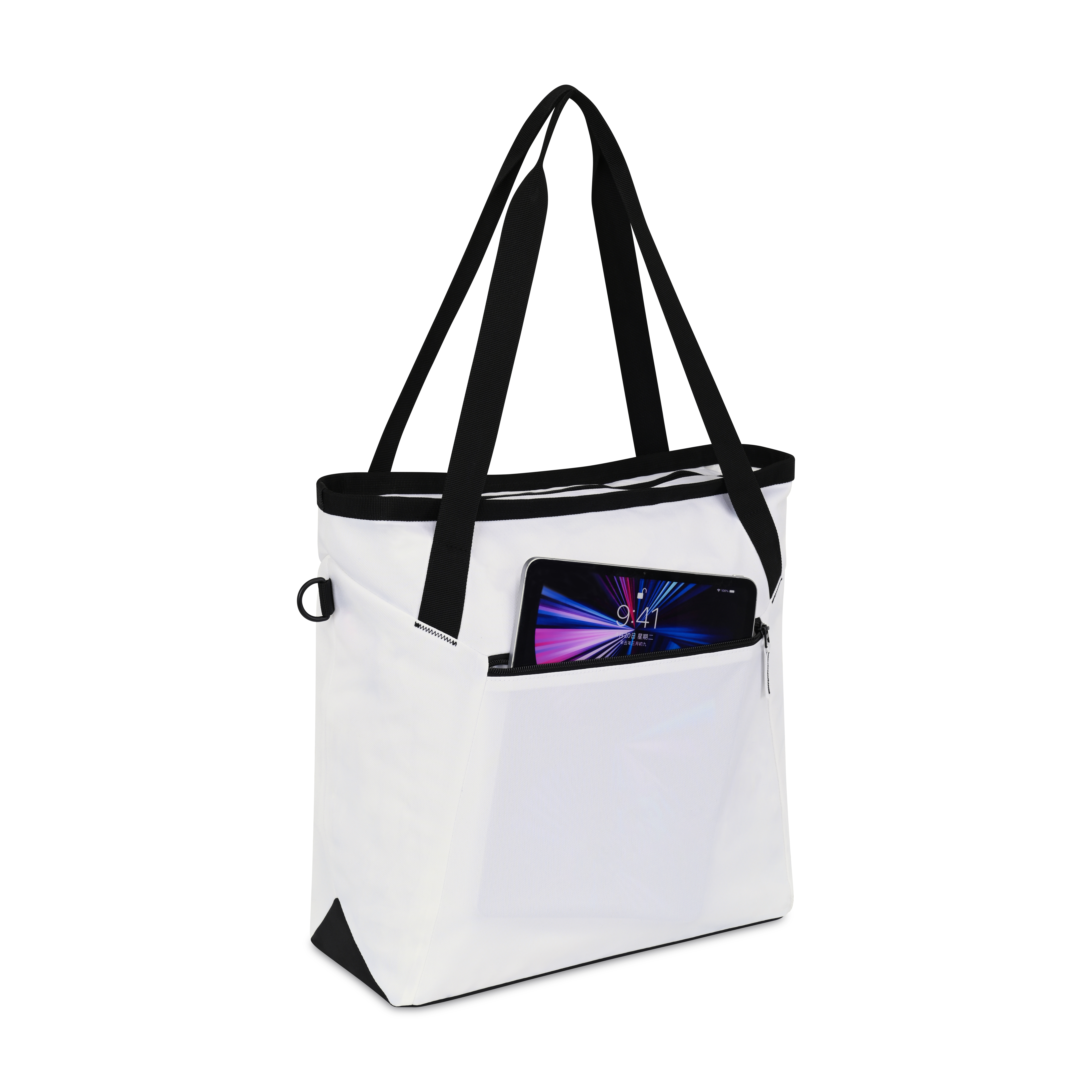 Game, set, carry. The Rally Recycled Courtside Tote is made from 100% recycled materials and designed to fit rackets securely with its zippered top. Multiple pockets—including side, interior, and front—keep gear organized, while a D-ring adds quick access for keys or sunscreen. Finished with top grab handles for easy carry.