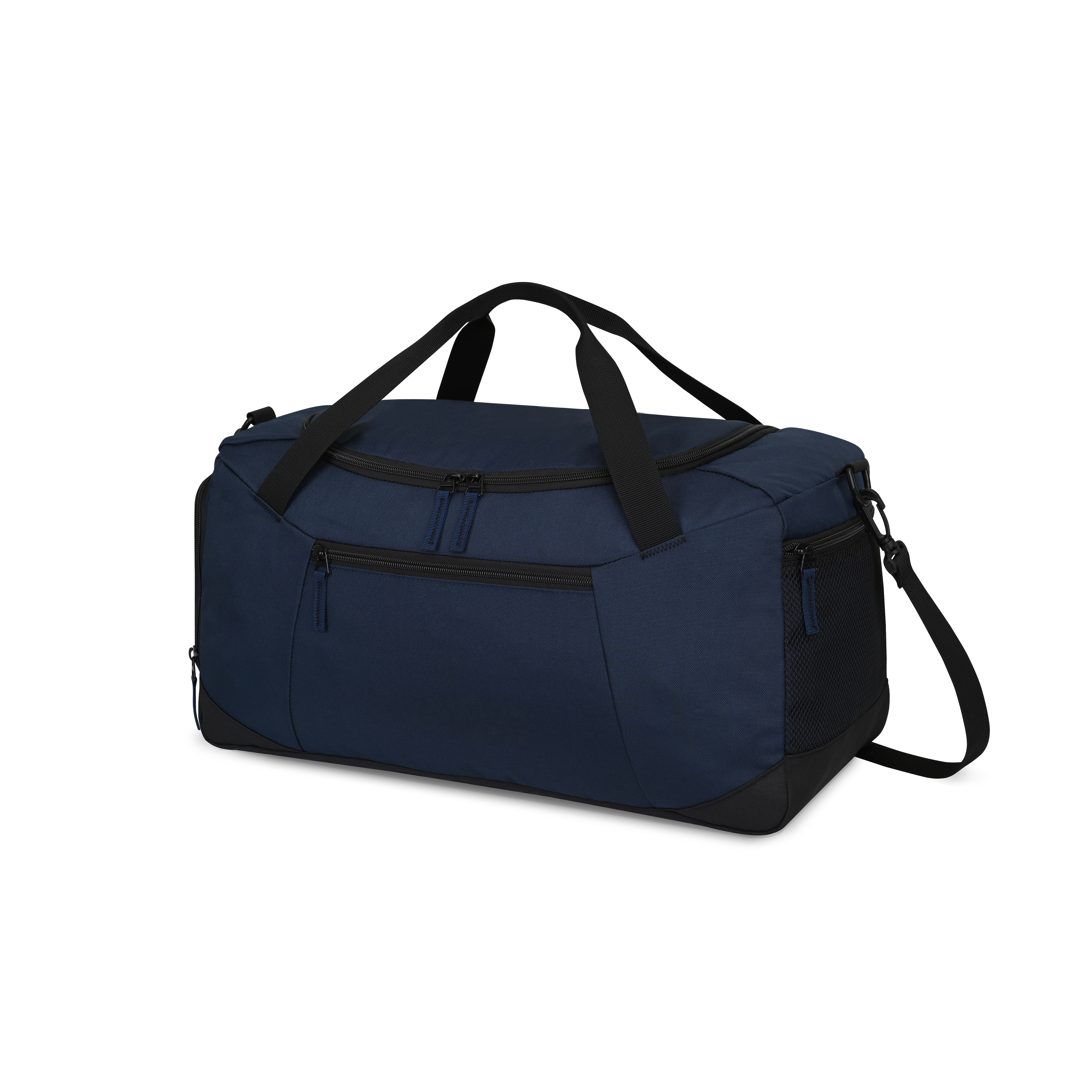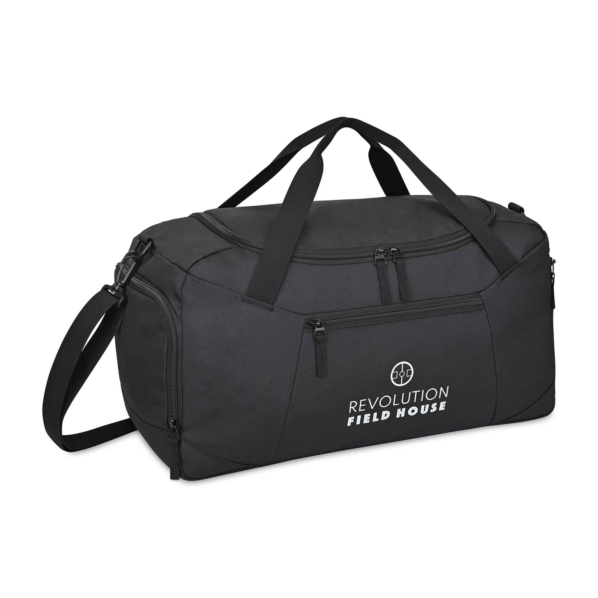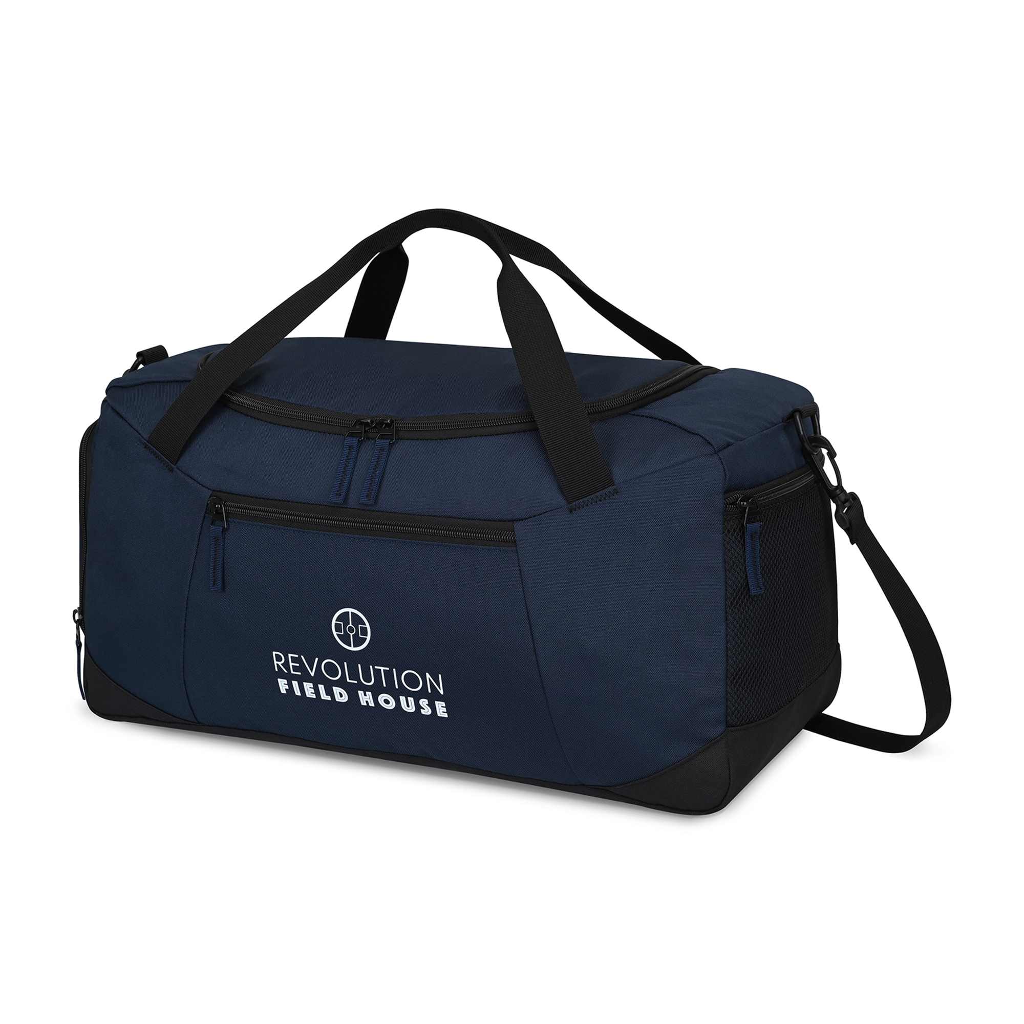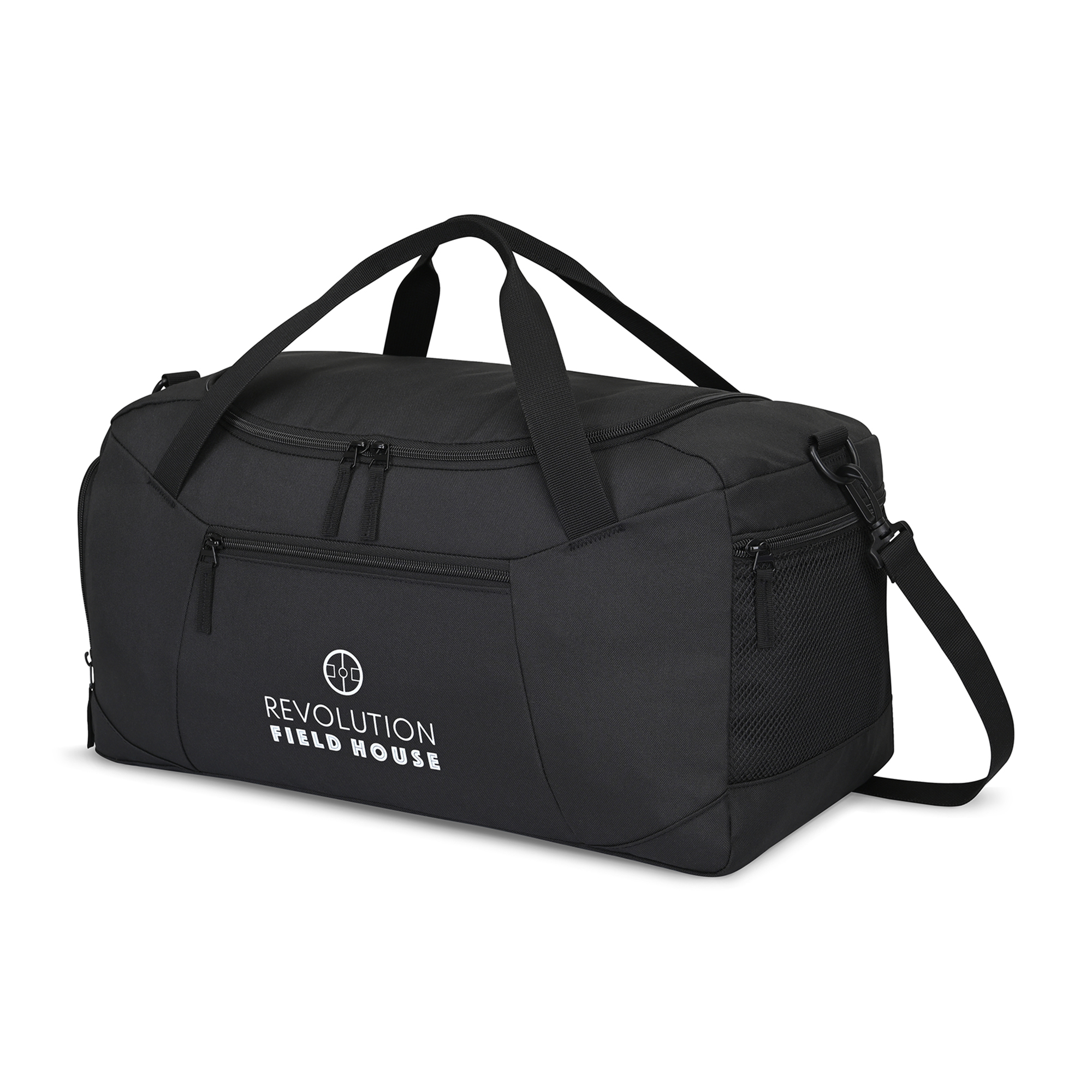 Gear up and go. The Rally Recycled Deluxe Sport Duffel is crafted from 100% recycled materials with a spacious main compartment, shoe tunnel, mesh stash pocket, and zippered front pocket for easy organization. Finished with sturdy grab handles and an adjustable, removable shoulder strap for versatile carry—perfect for gym, sports, or travel.