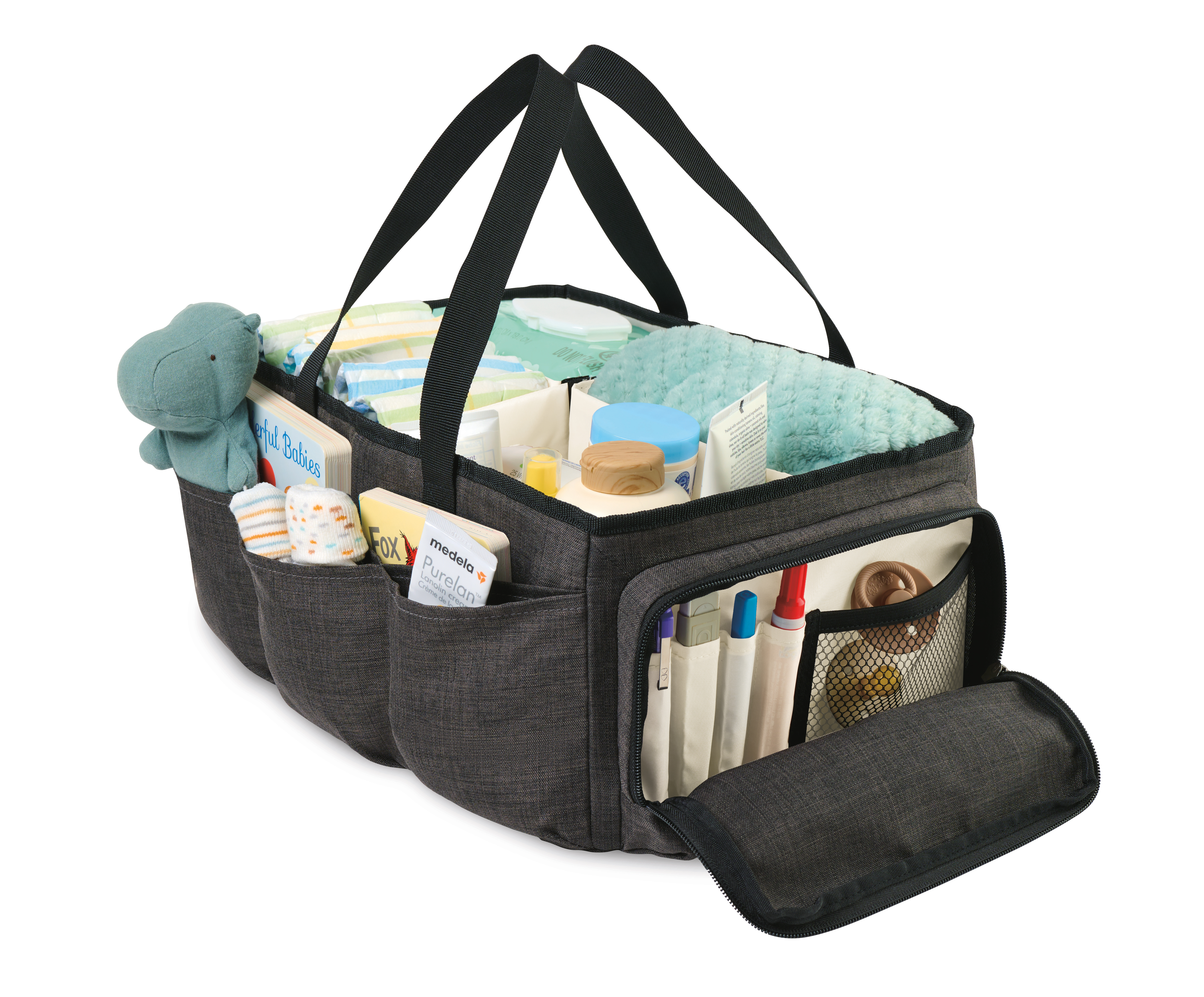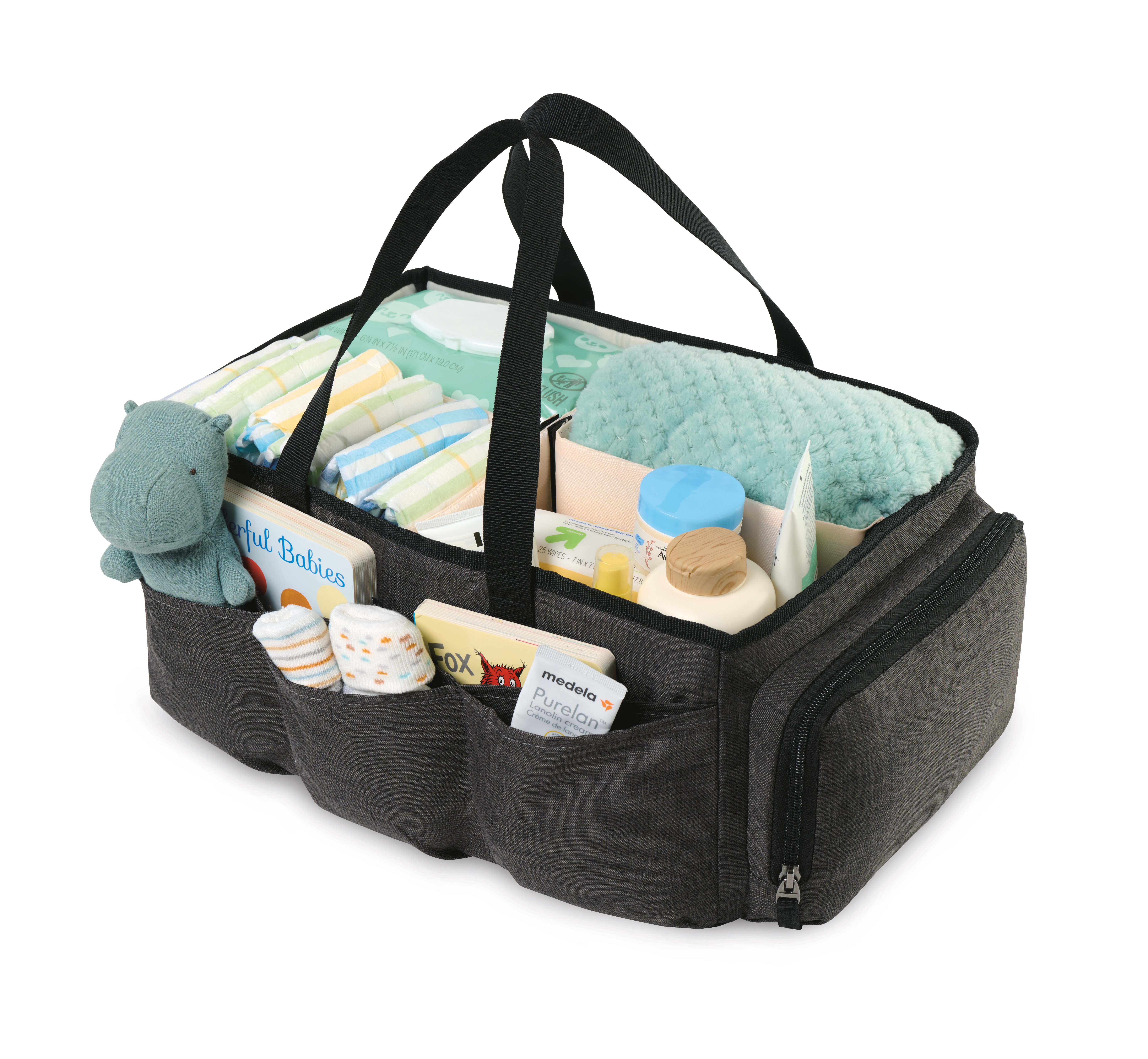 The Reagan Organizational Caddy is a portable nursery made for busy parents. With adjustable dividers, multiple zip and slash pockets, and foldable lightweight design, it keeps newborn essentials neatly organized at home or on the go. Long handles make it easy to carry for travel or everyday use.