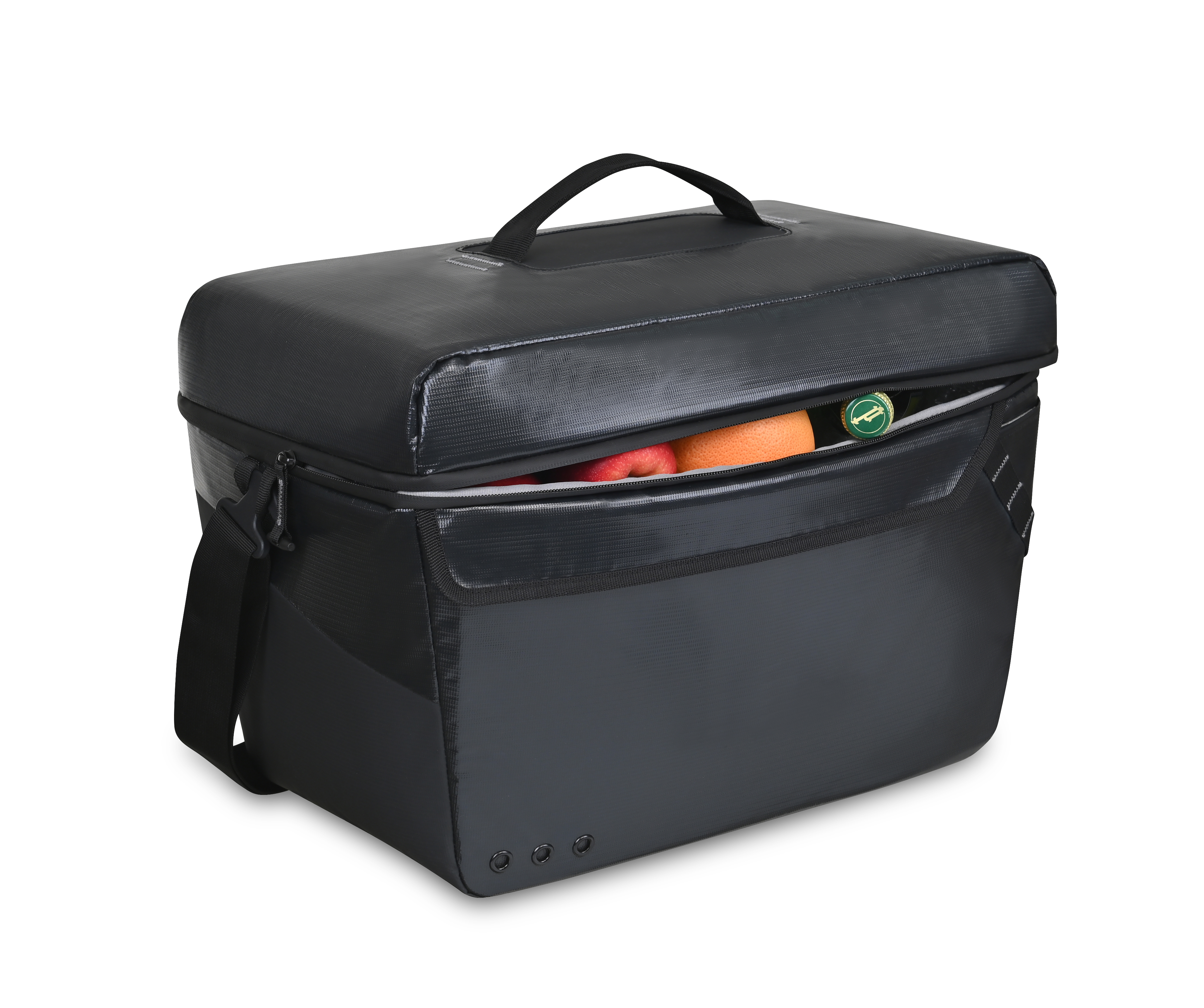 Keep things cool on your next off-road adventure with the Renegade Box Cooler. Made from wipeable and easy-to-clean tarpaulin material, the cooler also features grommets for debris drainage, daisy chain webbing detail, and a front flap pocket with hook and loop closure. Additional rubberized mesh rear slash pocket with hook and loop closure provides an extra place to store valuables. Adjustable removable padded shoulder strap (34"-60") for comfortable carrying.