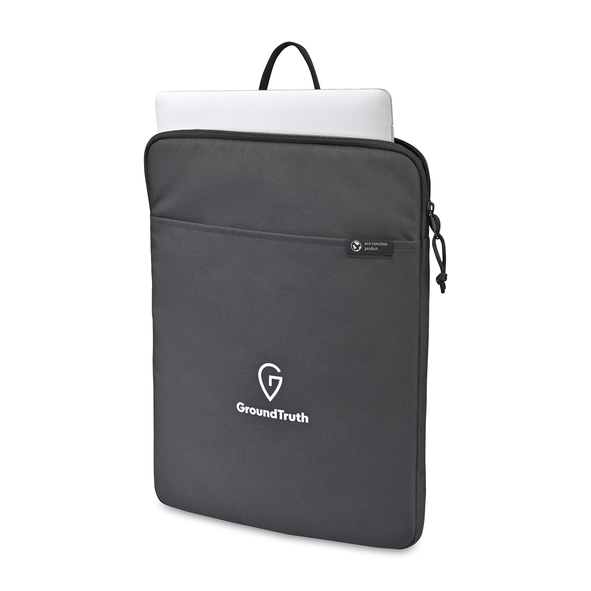 The Renew AWARE™ rPET 16" Laptop Sleeve offers modern style and eco-conscious design with recycled fabric, padding, and trims. Featuring a padded side-zip compartment, exterior slash pocket, and top grab handle, it fits most 16" laptops. Includes AWARE™ Virtual ID for verified sustainability.