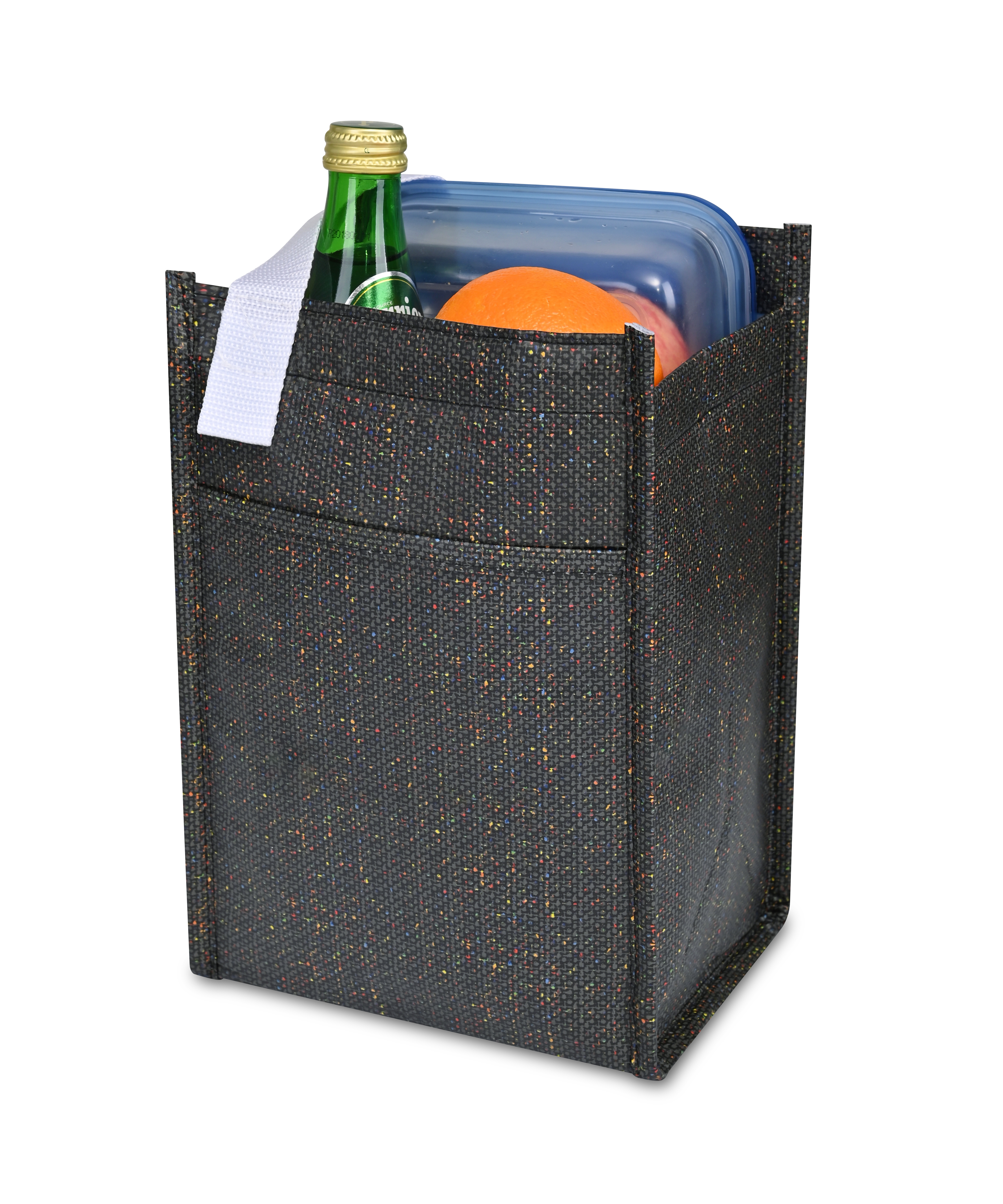 The Sami Cooler Collection features recycled laminated nonwoven material with a fashionably subtle fleck detail. Wipeable and durable PEVA lining. Hook and loop closure. Front slash pocket. Webbing loop on carry strap. One color screen print only. Holds 6 cans.