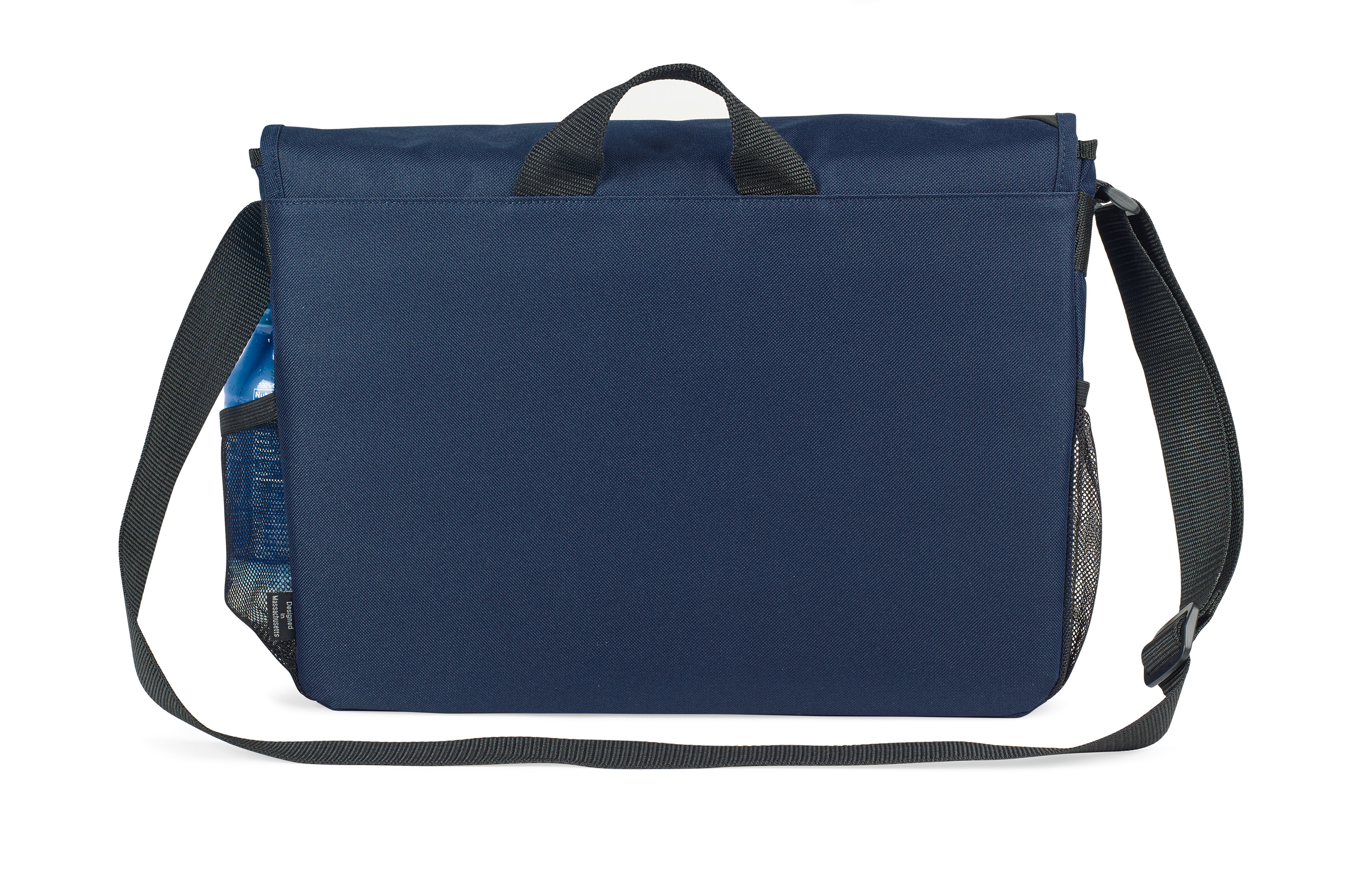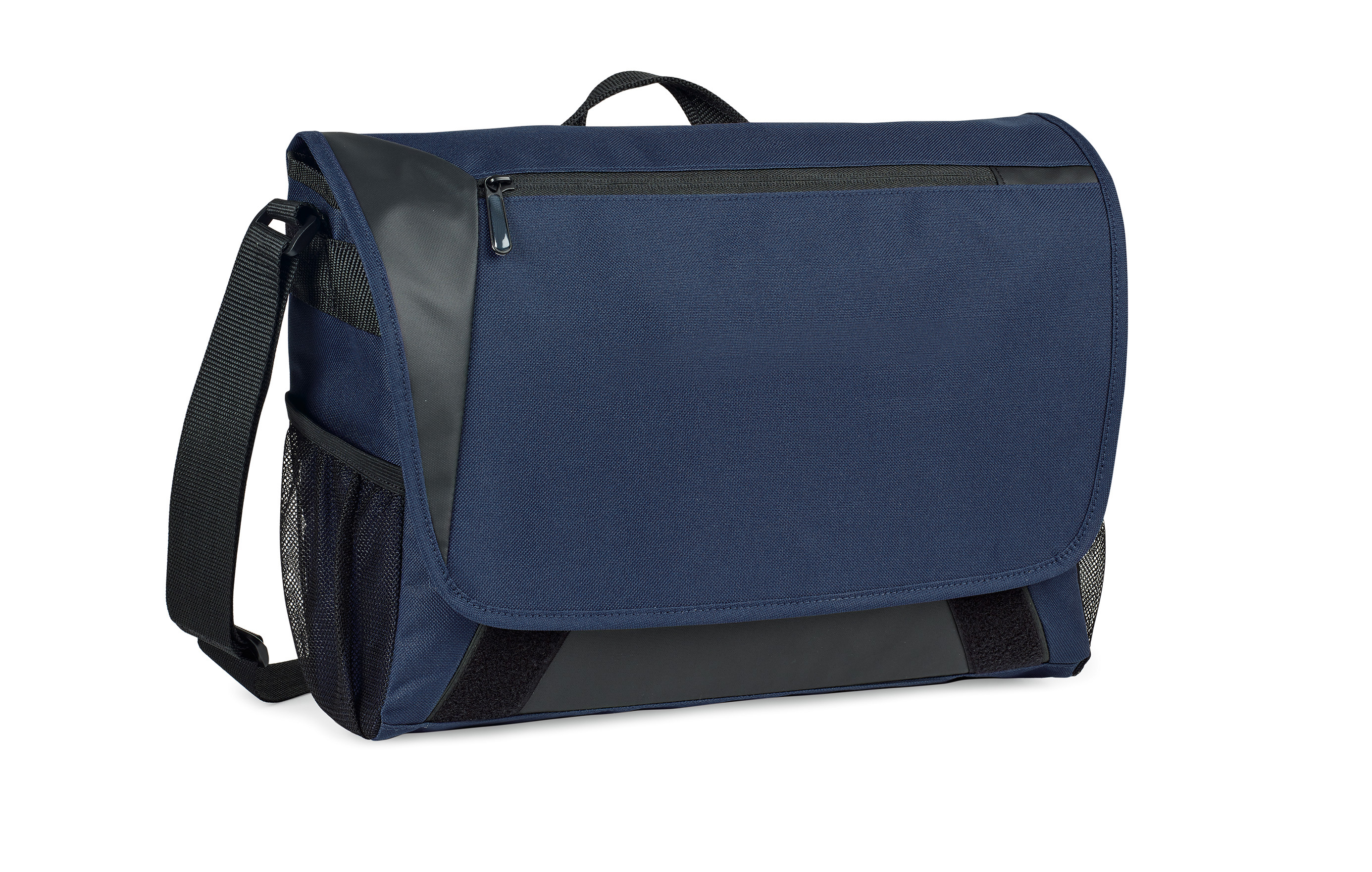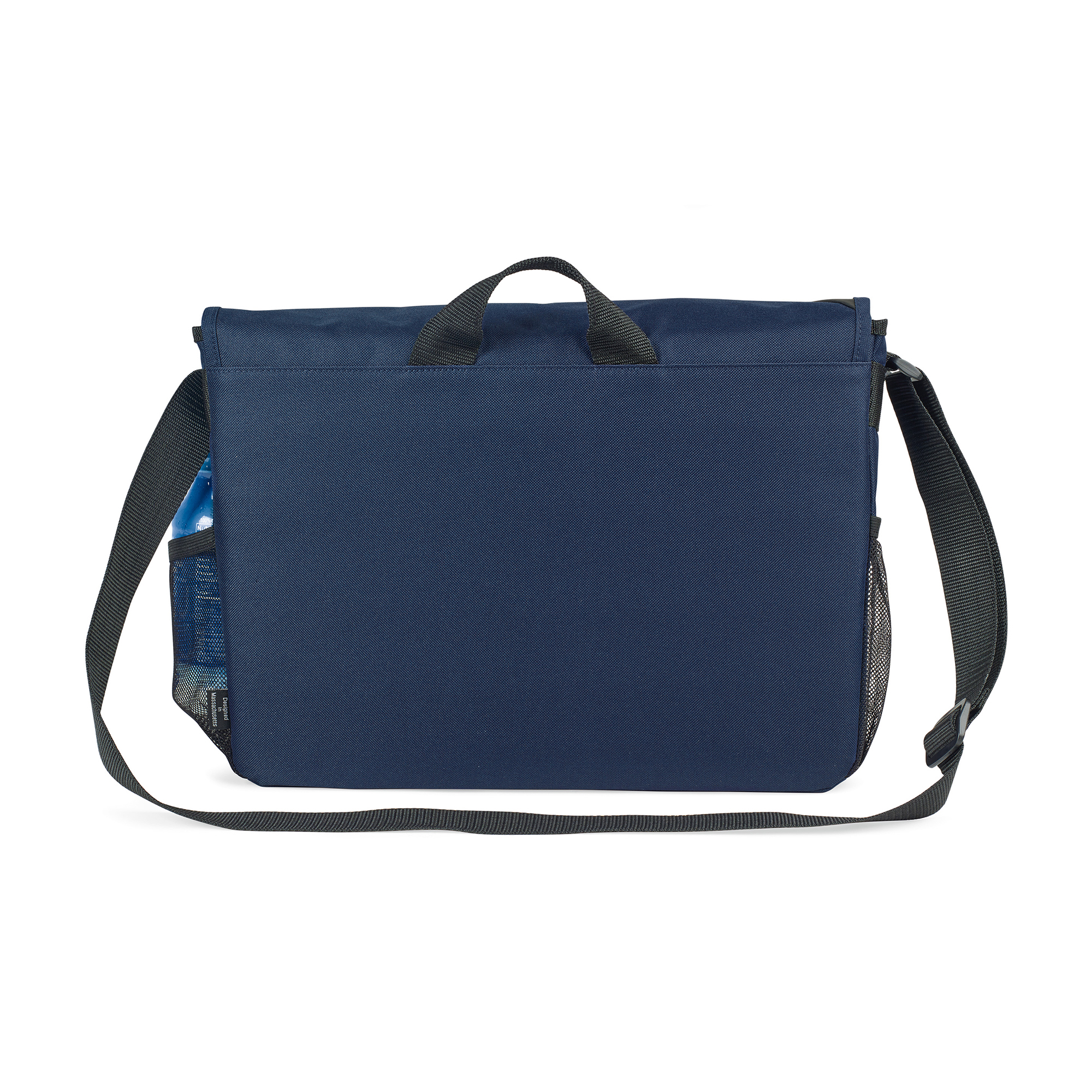 Large main compartment with hook and loop closure includes an interior laptop pocket (sized to hold up to a 15” laptop). Hook and loop closure can easily be adjusted based on how much is being carried in the main compartment. Front zippered pocket ideal for storing accessories. Zippered pocket and pen loop for additional organization under the front flop. Dual mesh water bottle pockets. Adjustable shoulder strap. Top grab handle.