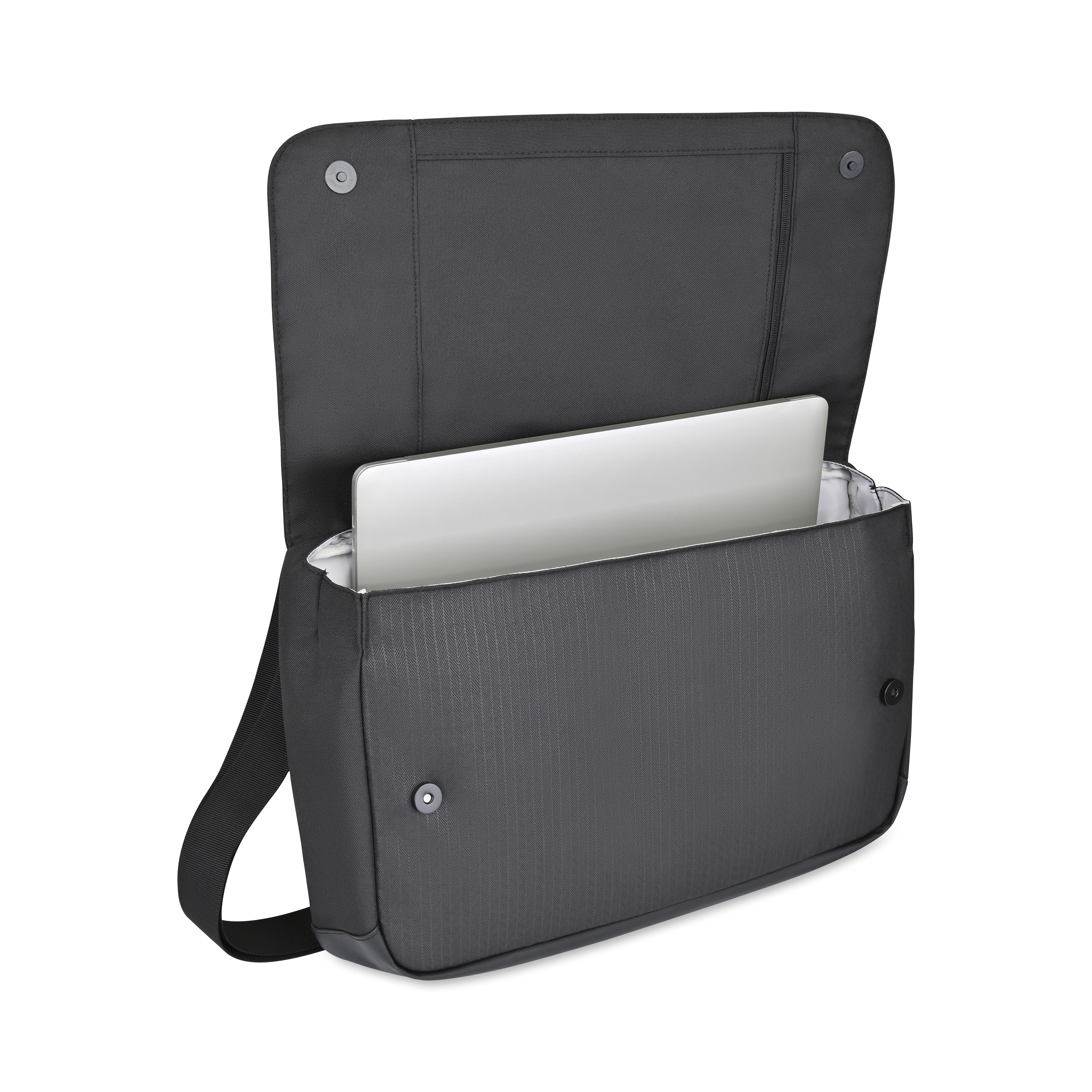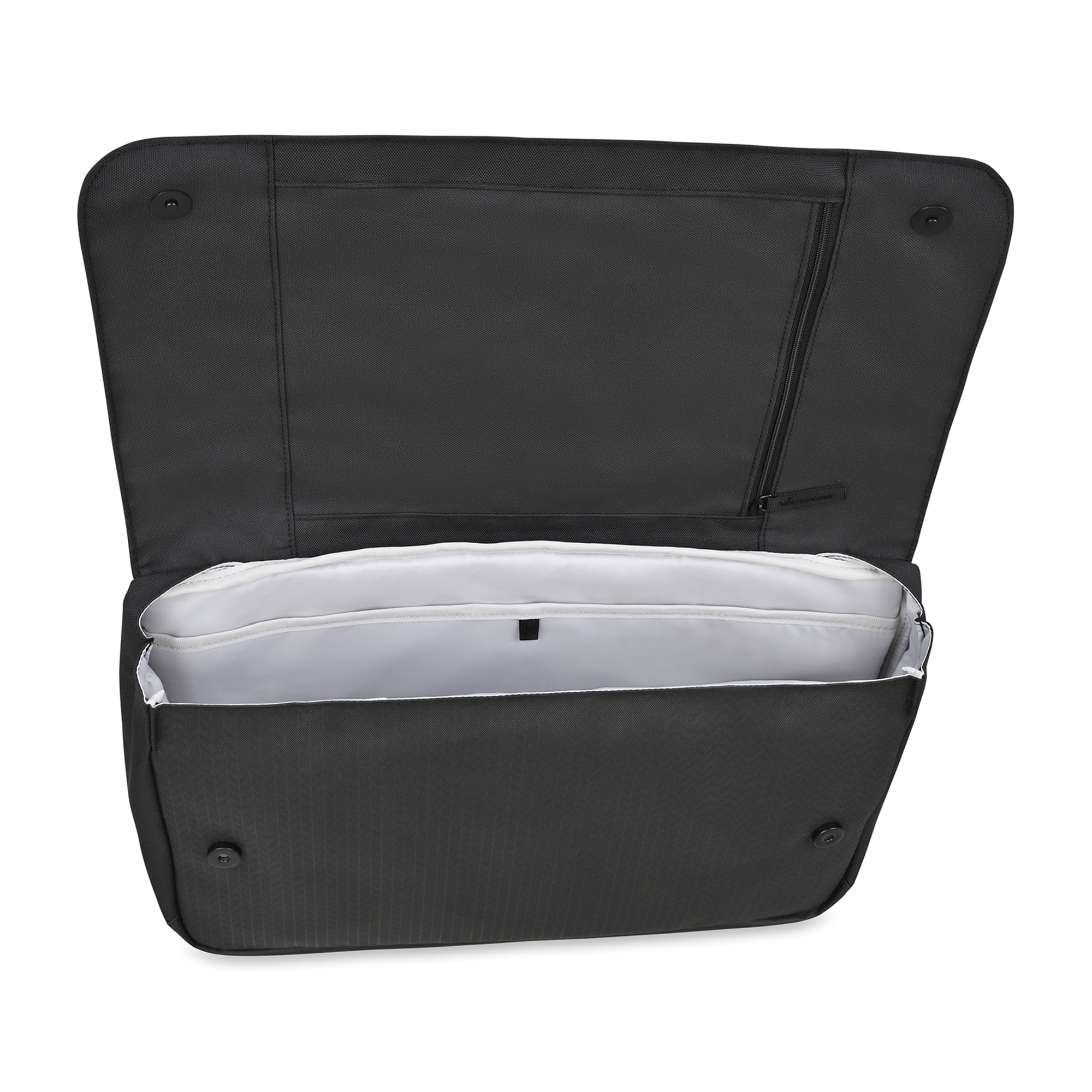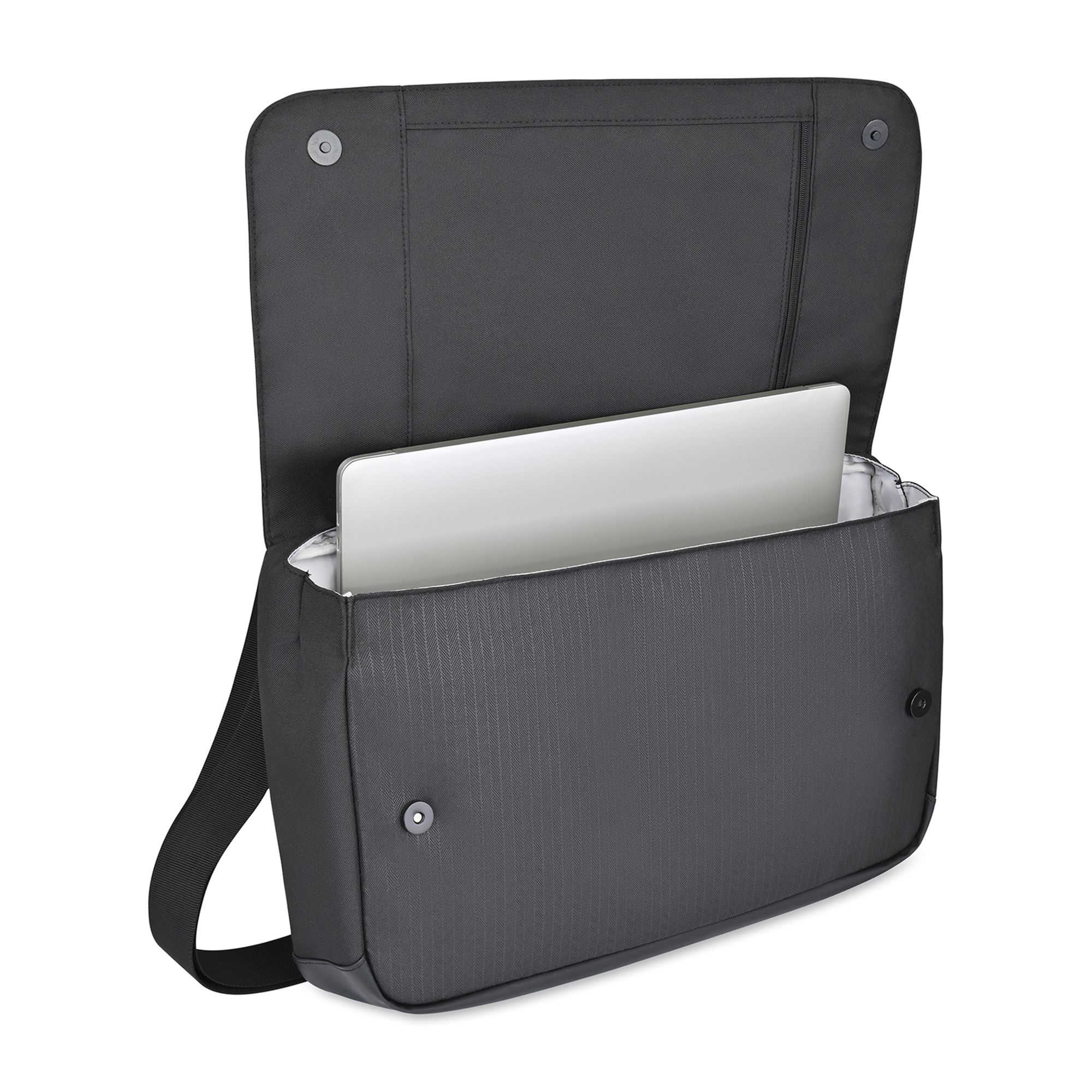 Streamlined for the commute. The Transit Laptop Messenger Bag fits laptops up to 16" and is made from recycled 600D rPET with a subtle stripe pattern. Featuring a front flap with magnetic closures, interior zip pocket, padded back panel, and an adjustable strap, it’s built for everyday carry. A TPU-coated bottom makes cleaning easy.