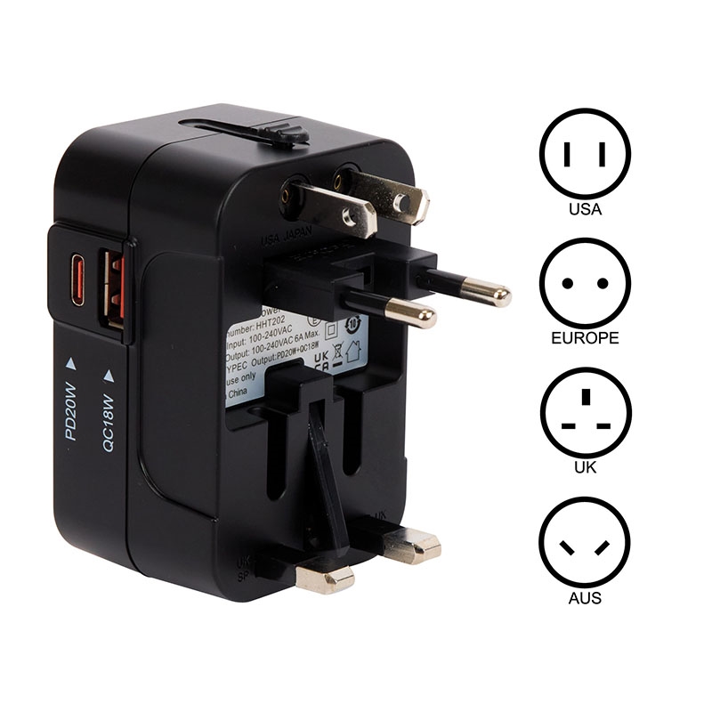 Stay connected wherever you go with Bellingham All-in-One Universal Travel adapter, designed to keep your devices powered in any corner of the world. Equipped with built-in multi-plugs, this adapter is compatible with American (US), European (Type C), British/UK (Type G), Chinese (Type I), and Australian (Type I) outlets, making it the perfect travel companion for globetrotters. Its compact design allows for easy portability, while the sturdy construction ensures durability during your travels. Input: 100-240V AC ~ 50/60Hz (max). Max Power: 1380W at 230V AC. UL® Certified, BC & FCC VOC Certified. USB-A Output: 5A-3A / 9A-2A / 12V -1.5A. USB-C Output: 5A-3A / 9A-2.22A / 12V -1.67A. This is a plug adapter only and does not convert voltage.