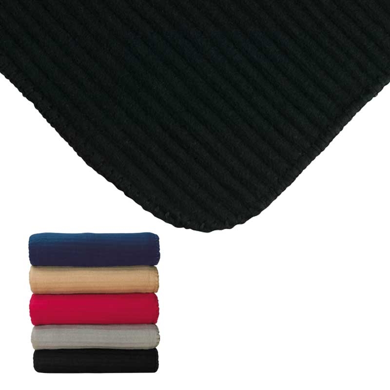 50" x 60" anti-pilling fleece blanket with whipstitch edging, 100% polyester.