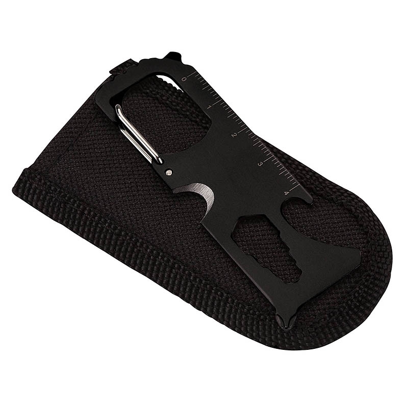 The Click 10-in-1 multifunction tool is a lifesaver in the palm of your hand. With its carabiner, Philips and flat head screwdrivers, belt cutter, bottle opener, 4 size hex tools, and 1 5/8"inch and 4cm rulers, it will save the day 10 times over. It's there when you need it most and takes up almost no space at all. Includes black carry sleeve with a belt loop.