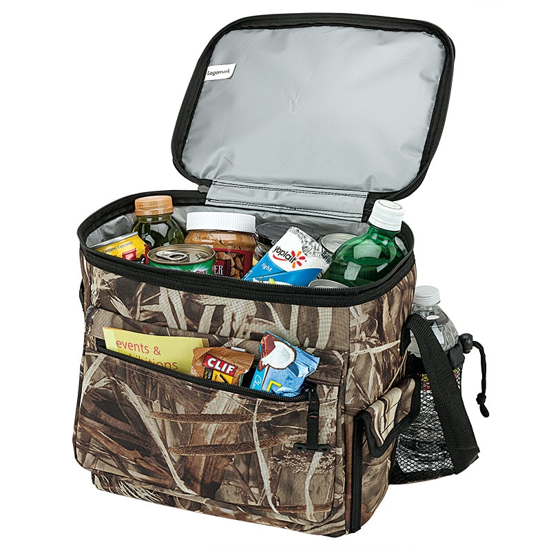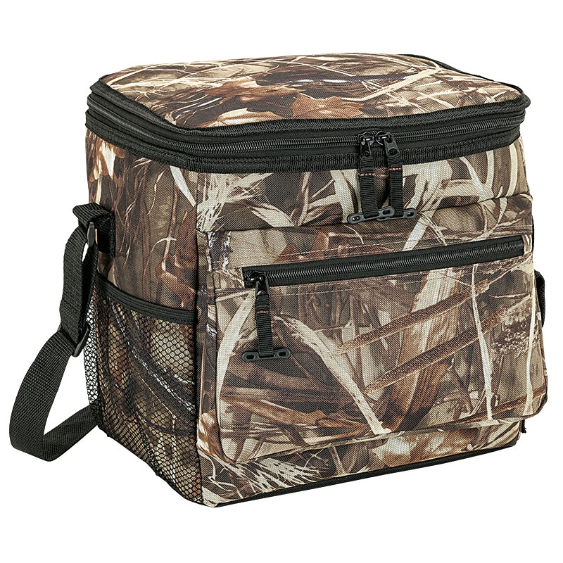 24-can capacity camouflage cooler features rugged 600D construction, a zippered main compartment with heat-sealed PEVA lining, front zippered pocket, side pocket with hook & loop flap, mesh side pocket, T-Bar zip pulls, drawstring water bottle mesh pocket, bottom stiffener and a 1 1/4"x 46" adjustable shoulder strap.