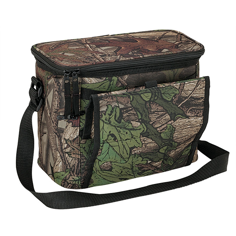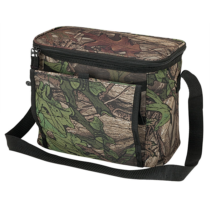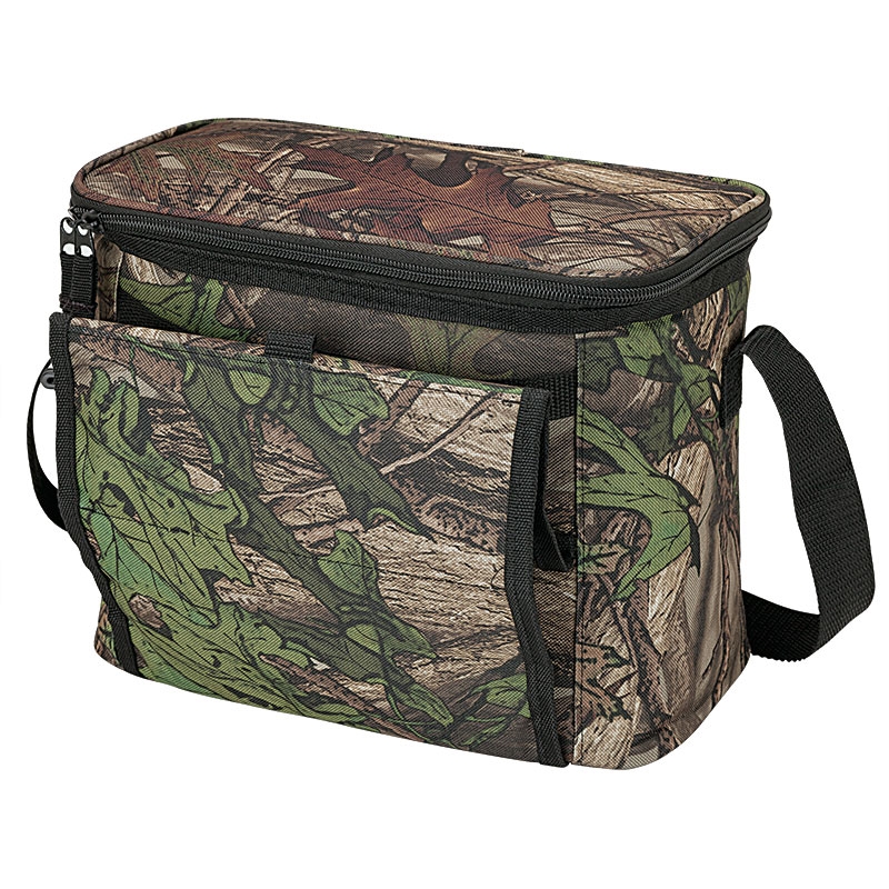 12-can capacity camouflage cooler features PEVA heat sealed lining, durable 600D outer material, zippered closure, bottom stiffener, T-bar zip pulls, 1 1/4" x 40" adjustable shoulder strap and a fold-away dual cup holder with hook and loop closure.
