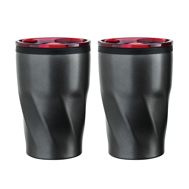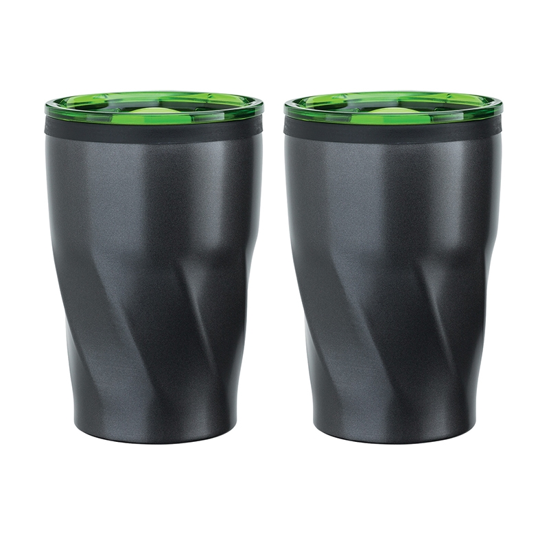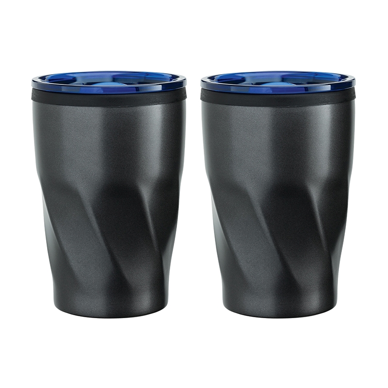 The Kafé II Two-Piece Coffee Tumbler Gift Set comes with two Kafé tumblers enclosed in a classic black medium-sized gift box. This is a great gift set for your friends and co-workers who want to start their days with a fresh brew of their favorite coffee. Whether rushing to work in the morning or to the gym in the afternoon, these tumblers are the perfect fit for most single serve coffee machines and car cup holders. Each tumbler has a 12 oz. capacity, an ergonomic twist grip design, and a non-slip base. They have stainless steel outer and polypropylene inner lining and each tumbler comes with a colored translucent slider lid with a silicone ring. Tumblers are FDA compliant and BPA free.