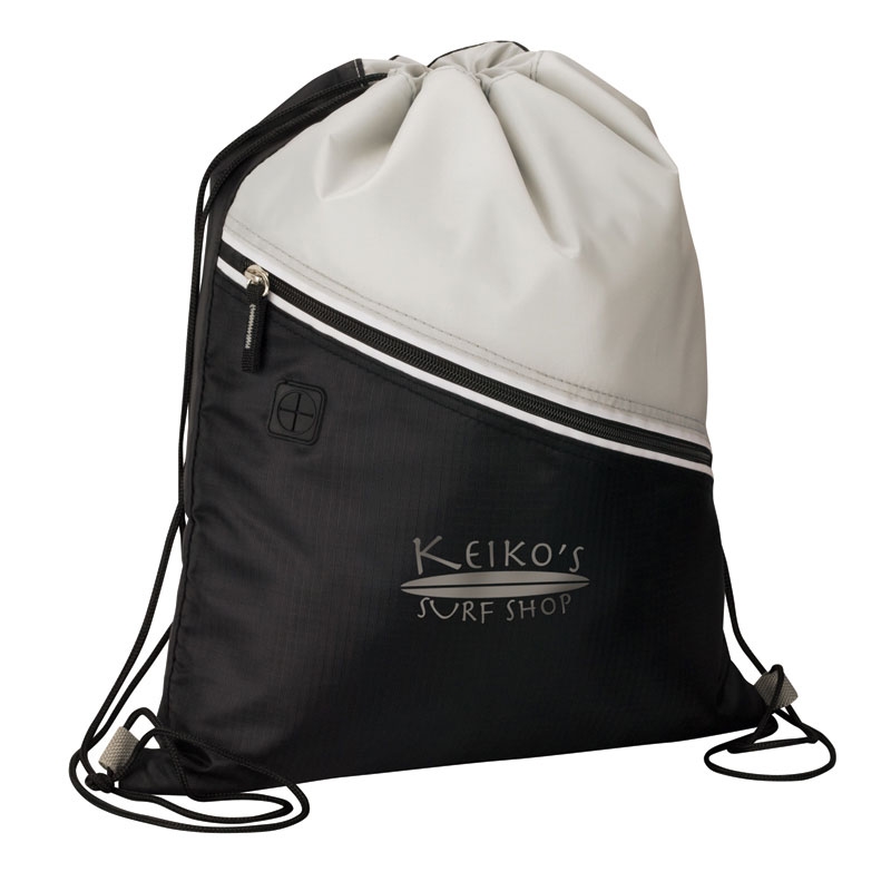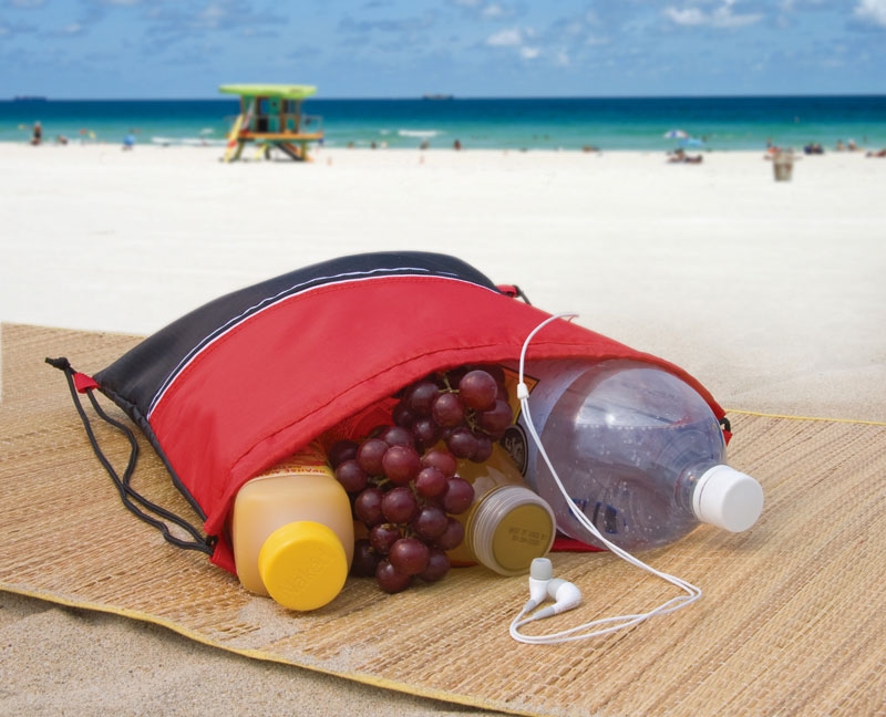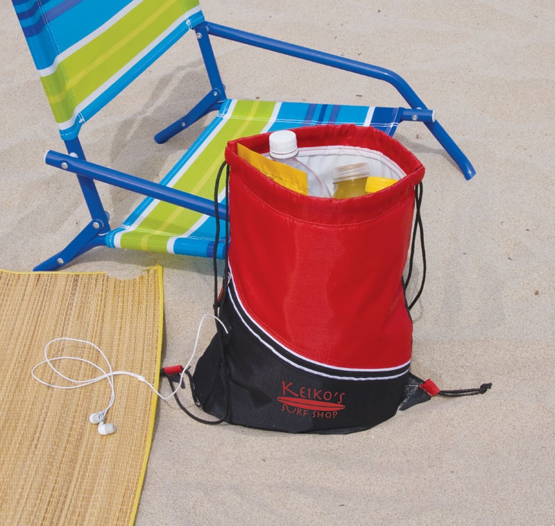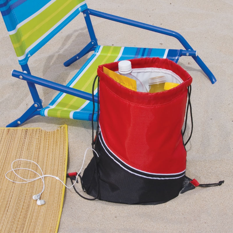 The Mazzo Drawstring Cooler bag has heat-sealed PEVA insulation, a zippered front pocket and a media headphone access hole. The drawstrings double as backpack straps.
