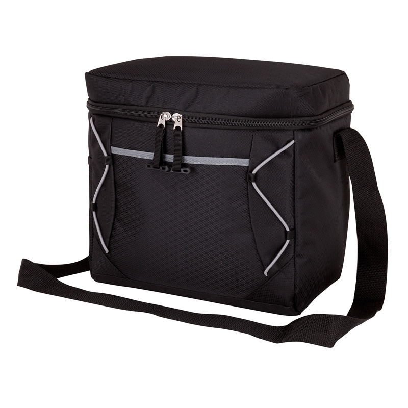The Monterey cooler bag is made of lightweight diamond 420D polyester and durable 600D. It has insulated heat sealed silver PEVA lining and holds 16 cans in its main compartment. It has a side mesh pocket, a front pocket and a large zippered main compartment with a T-Bar zip pull. The 1 1/2" x 48" shoulder strap is adjustable for a comfortable carry, and the front pocket has grey trim with an elastic cord on each side.