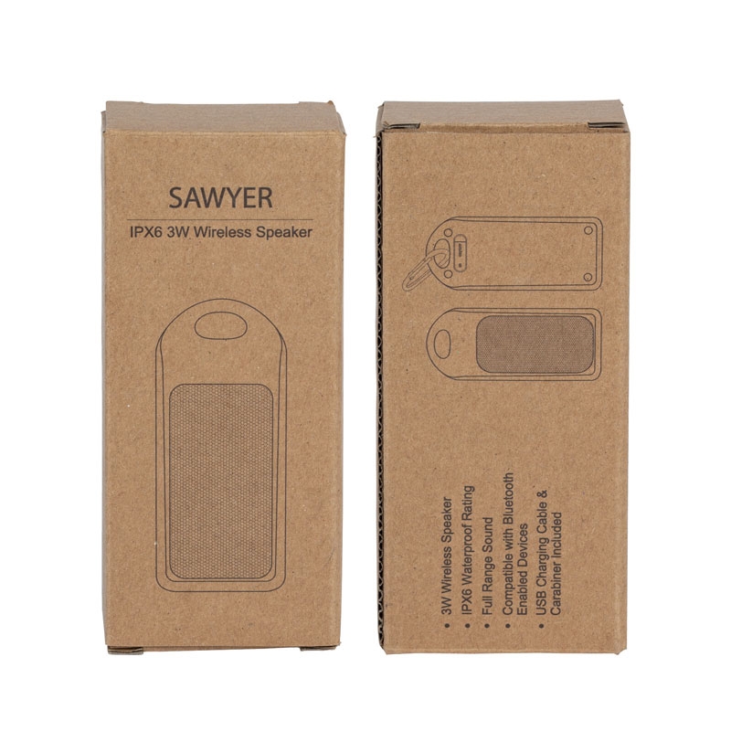 The Sawyer Waterproof Bluetooth Speaker is lightweight and compact and its 3 watt speaker provides excellent sound quality for any adventure. The speaker comes with an aluminum carabiner to allow it to be clipped to your favorite backpack while traveling and its IPX6 waterproof rating will keep it safe from the elements. Enjoy your music up to 1.5 hours at max volume on a single charge within a working range of 10 meters (33 feet). The Sawyer includes a micro-USB charging cable to recharge its 300mAh lithium battery and comes in a brown gift box. Specs: Bluetooth Version 5.0; Playback time- 1.5 hours per charge; Charge time- 1.5 hours; Frequency- 100HZ-- 20KHZ; SNR- ≥90.