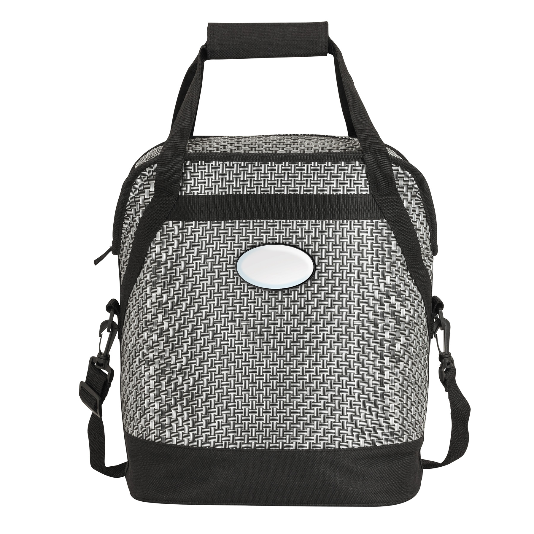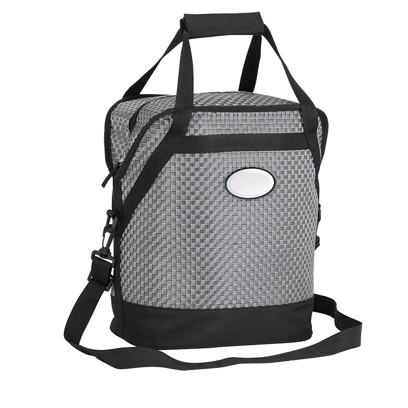 20-can cooler with woven poly mesh fabric and black trim, zippered main compartment with heat-sealed PEVA lining, carry handles with hook and loop pad, 1 1/2" x 46 1/2" removable and adjustable shoulder strap.