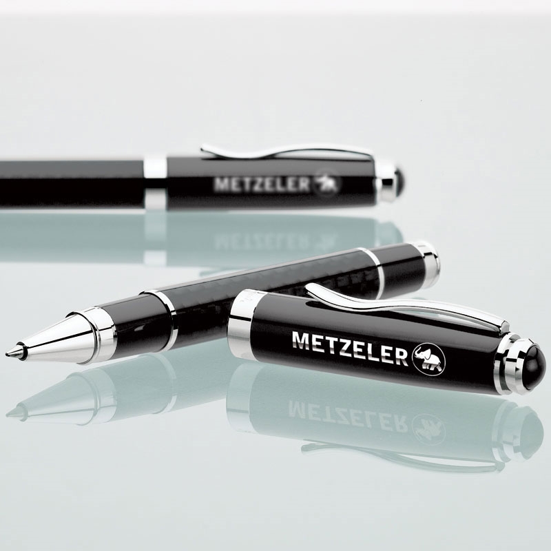 Cap-off design rollerball pen with carbon fiber barrel and glossy black cap.