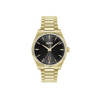 BOSS Cheswick Gents. 40MM Yellow Gold IP Case. Yellow Gold IP Bracelet with push button deployment clasp. Black dial with date display at 6 o'clock. Mineral Crystal. Water resistant to 5 ATM. Quartz Movement.