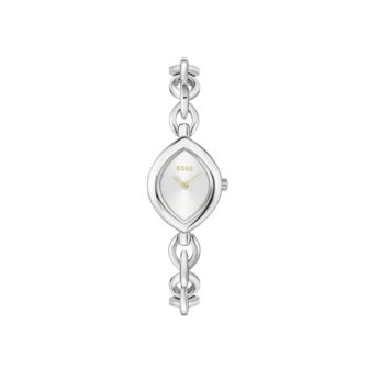 BOSS Fiora Ladies. 29MM Oval Stainless Steel Case. Stainless Steel chain Bracelet with Jewelry buckle. Silver White dial. Mineral Crystal. Water resistant to 5 ATM. Quartz Movement.