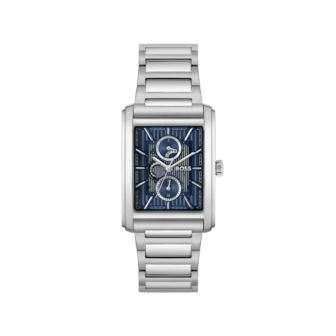 BOSS Principle Dress Multi Gents. 42.5MM Stainless Steel rectangle Case. Stainless Steel Bracelet with push button deployment clasp. Blue multi function dial. Mineral Crystal. Water resistant to 5 ATM. Quartz Multi-function Movement.