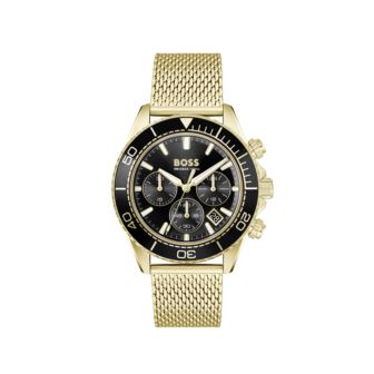 Boss Sealiner Gents. 44mm Gold IP Case with black Bezel. Gold IP Mesh bracelet with sliding buckle. Black Chronograph Dial with date display at 4 o'clock. Mineral Crystal. Quartz Chronograph Movement. Water Resistant to 5 ATM.