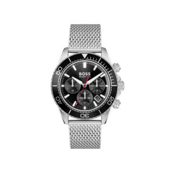 Boss Sealiner Gents. 44mm Stainless Steel Case with black Bezel. Stainless Steel Mesh bracelet with sliding buckle. Black Chronograph Dial with date display at 4 o'clock. Mineral Crystal. Quartz Chronograph Movement. Water Resistant to 5 ATM.
