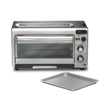 Unclutter your counter with the Hamilton Beach 2-in-1 Oven and Toaster. This unique combo lets you cook personal-sized pizzas with a tender, crispy crust and toast bread evenly in 40% less time than a traditional toaster oven. With the simple slide of a lever, switching from the extra-wide slot toaster to the spacious oven is easy, making it perfect for the morning breakfast rush or busy weeknight dinner.