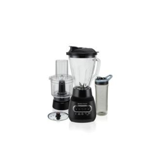 The versatile Hamilton Beach MultiBlend Kitchen System does the work of 3 separate appliances: a traditional kitchen blender, a food processor, and a personal blender. It has a powerful motor with 800 watts of peak power that crushes ice, blends, mixes, chops, slices, shreds and more. A single MultiBlend Blade System handles all your blending and food processing needs. Just choose the right attachment: the 52 oz. glass MultiBlend Jar, the 20 oz. personal jar for single-serve smoothies and shakes, or the food processor attachment with an included slicing and shredding disc. Use the 52 oz. glass blending jar with drip-free pouring spout to make a batch of milkshakes or to puree fresh pasta sauce. Or swap the jar for the 3-cup food processor attachment to chop vegetables or mince garlic for a stir fry; it includes a chute and food pusher to make adding foods easy. The single-serve 20 oz. travel jar is perfect for morning smoothies when you're in a hurry. It's BPA free and includes a leak-proof lid for drinking on the go. Designed for quieter blending, the Hamilton Beach MultiBlend Kitchen System is easy to operate, with all the power you need and simple controls.