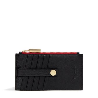 Your schedule is booked. That's why we've created one essential wallet that conquers every calendar entry. Stash credit and transit cards in up to 8 secure slots, and store meter change in one zippered pocket. Plus, enjoy a clear ID slot when that cute bouncer asks for a peek at your license. Crafted with buttery black leather. Red cotton twill lining. Brushed gold hardware and red zip, guaranteed for life. Credit card slots, snap and zipper closure. 3" L x 1/4"W x 6"H