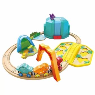 Explore a prehistoric world with this amazing dinosaur train set! Ride through the volcano and waterfall and then stack them up with the dinosaurs. There are even sound effects when ridden over the interactive train track.