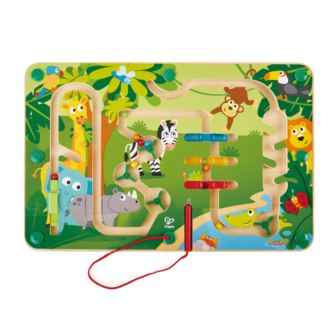 Explore a wild jungle with magnetic-wand fun! The Hape Jungle Magnetic Maze (SKU E1714) lets children tilt the board or use the included wand to guide the magnetic balls through pathways, corners and revolving doors. With seven jungle animals included, it offers hands-on motor-skill development and imaginative play for ages 2 years and up.