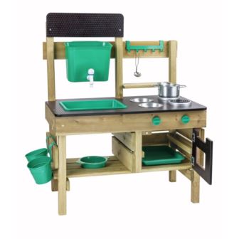 Invite your guests over for a delicious meal and cook for them outside in the garden with this wonderful outdoor kitchen! This cute playset includes one pot, one ladle, two bowls, two flowerpots, one sieve, one water tank, one sink with faucet and one oven plate - everything you need to create a delicious outdoor meal! Fill the water tank and turn the tap to fill the sink. You can use what you find in the garden to make mudpies, grass pizza, anything you like! Advertise your menu on the blackboard and plant some flowers or vegetables in the two included flower pots. This great interactive toy allows little ones to imitate grown up behaviour in a fun, safe way and is wonderful for encouraging active, outdoor play. The kitchen is also perfect for helping develop imagination, language skills and social skills. Made using sustainable Green PE plastic and FSC wood. Suitable for ages 3 and above.