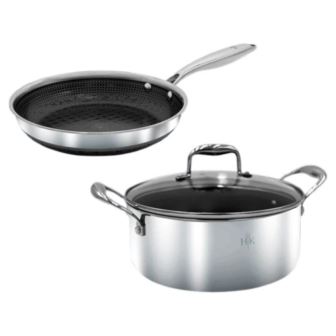 Cook confidently with the Hell's Kitchen PFAS-Free Hybrid 3-Piece Medium Pot Set. Featuring tri-clad stainless-steel for rapid, even heat transfer, a diamond-reinforced ceramic nonstick surface (PFAS-free), and a sleek tempered glass lid that fits both pieces. Equipped with stay-cool stainless handles and a lifetime warranty, this set blends safety, performance, and elegance for everyday cooking.