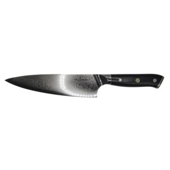 The Hell's Kitchen 8" Chef Knife is expertly crafted from 67-layer Japanese Damascus steel featuring a razor-sharp 15° edge for flawless chopping, slicing, dicing, and mincing. Built with full-tang construction for impeccable balance and a G10 fiberglass handle that resists slipping, it delivers durability you can rely on. At 9 oz with a 13" overall length, this knife combines performance, comfort, and style.