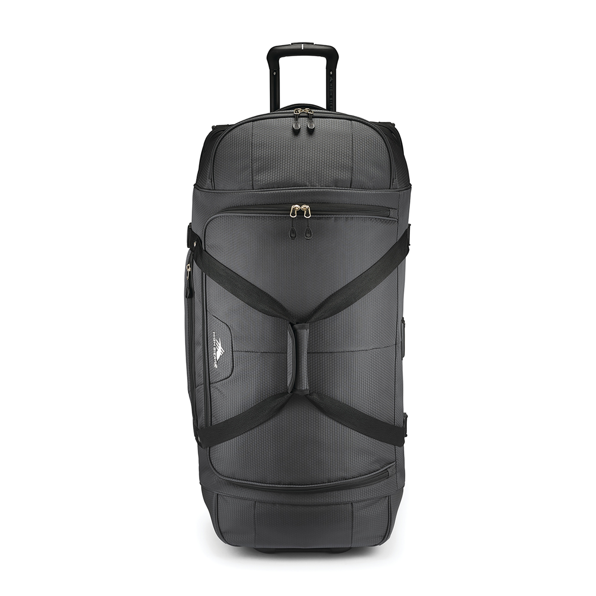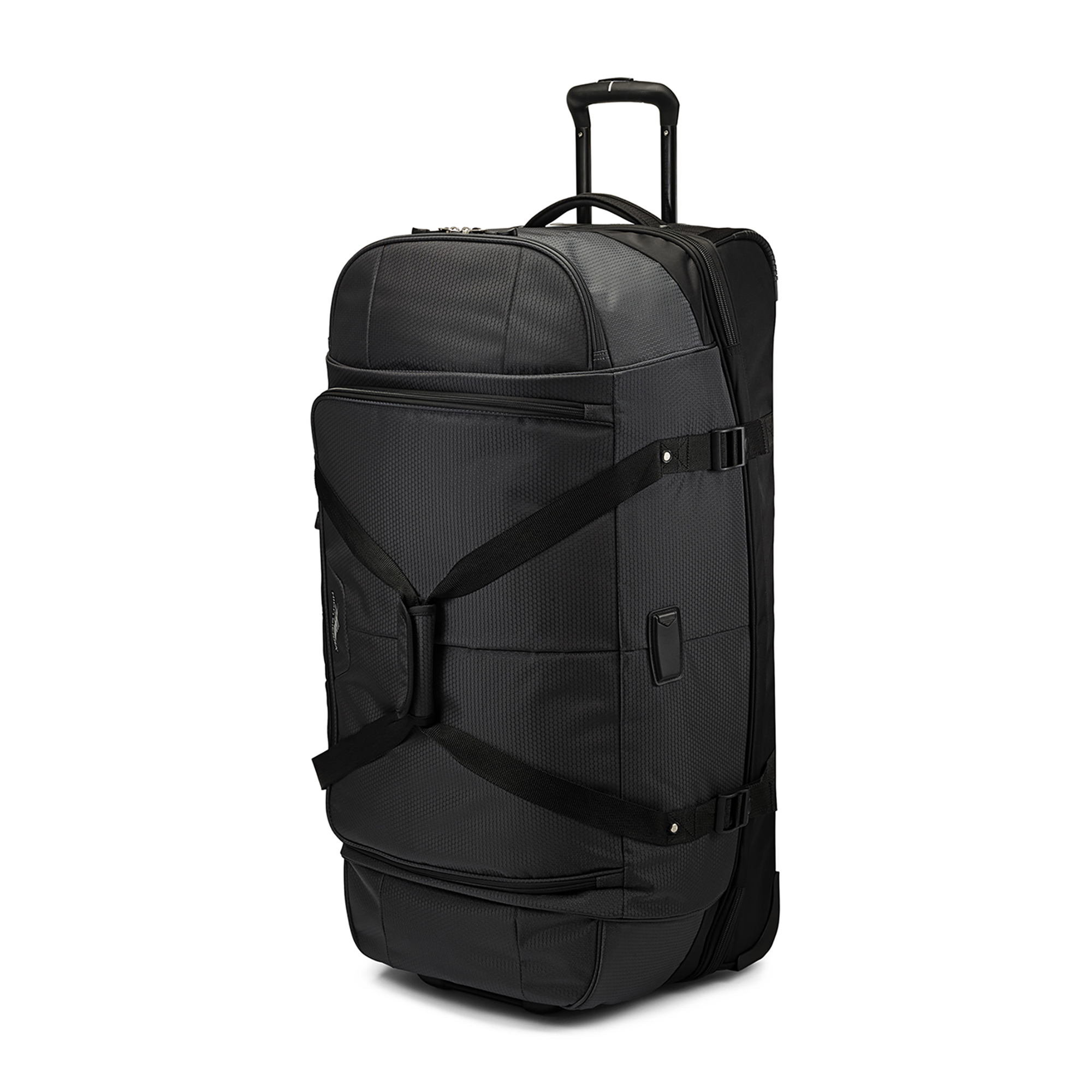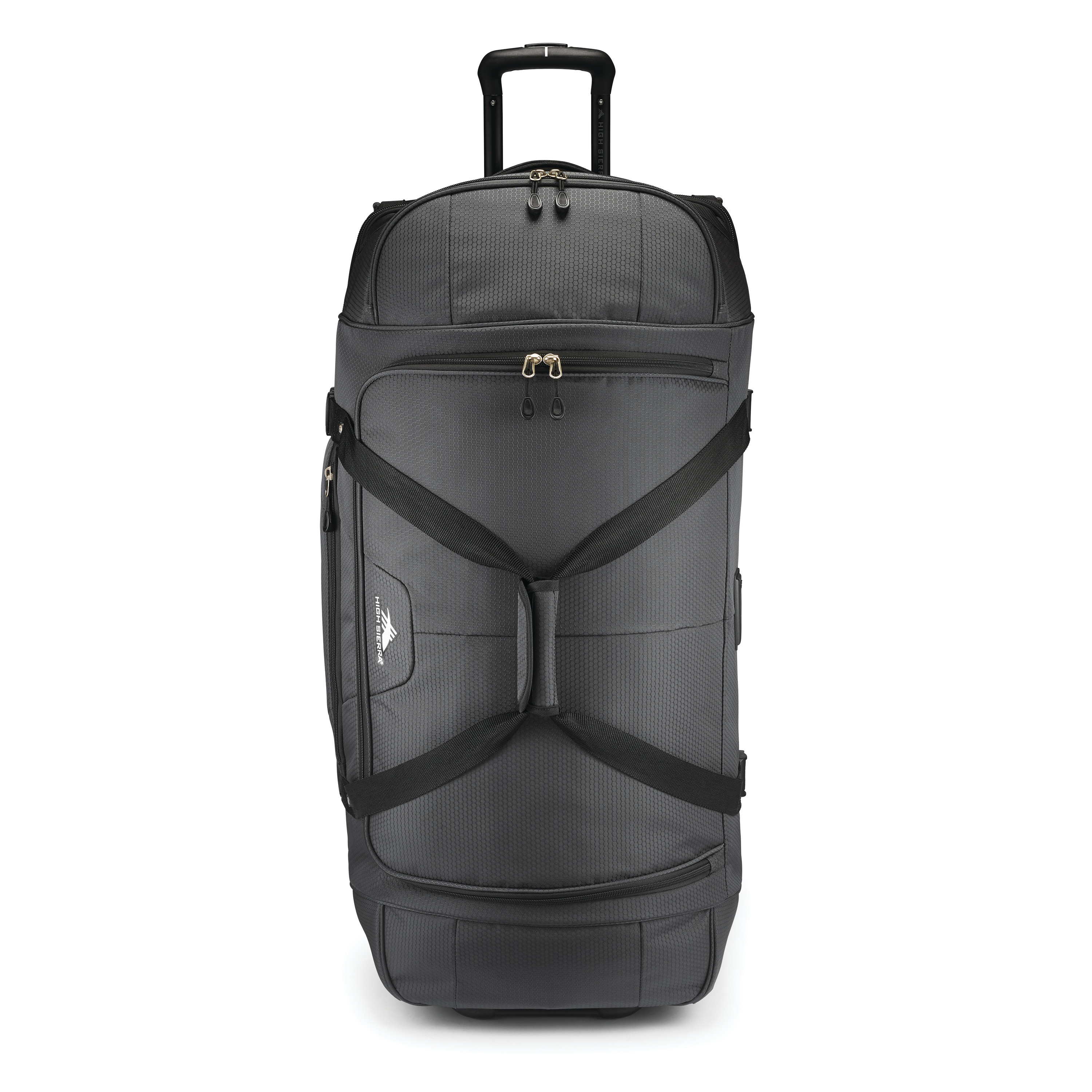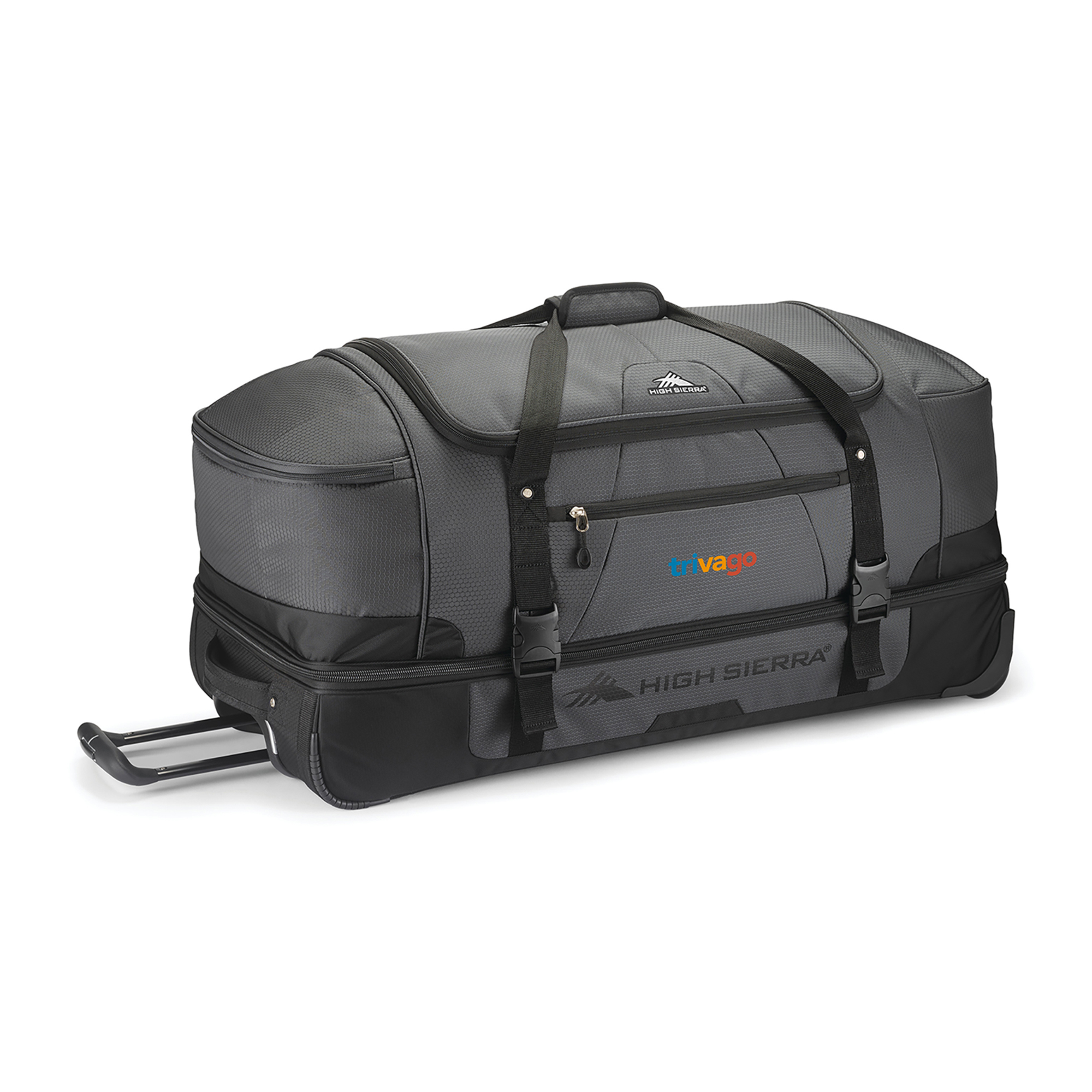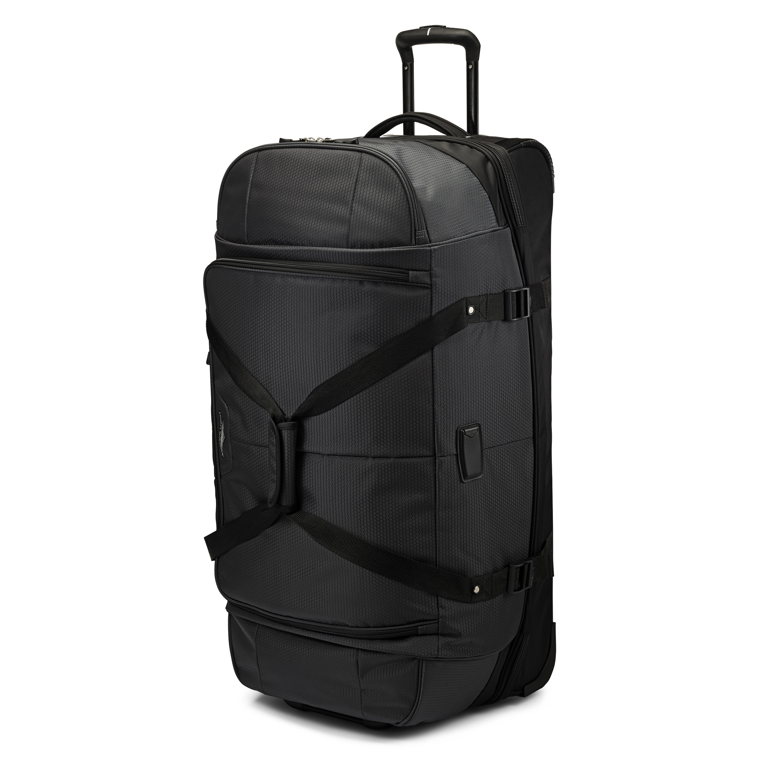 The High Sierra® Fairlead 34" Drop Bottom Wheeled Duffel offers versatile packing with a spacious main compartment, drop-bottom section with garment straps, and multiple zip pockets. Built for travel ease, it features a recessed telescoping handle, in-line skate wheels, and grab handles for quick carrying.