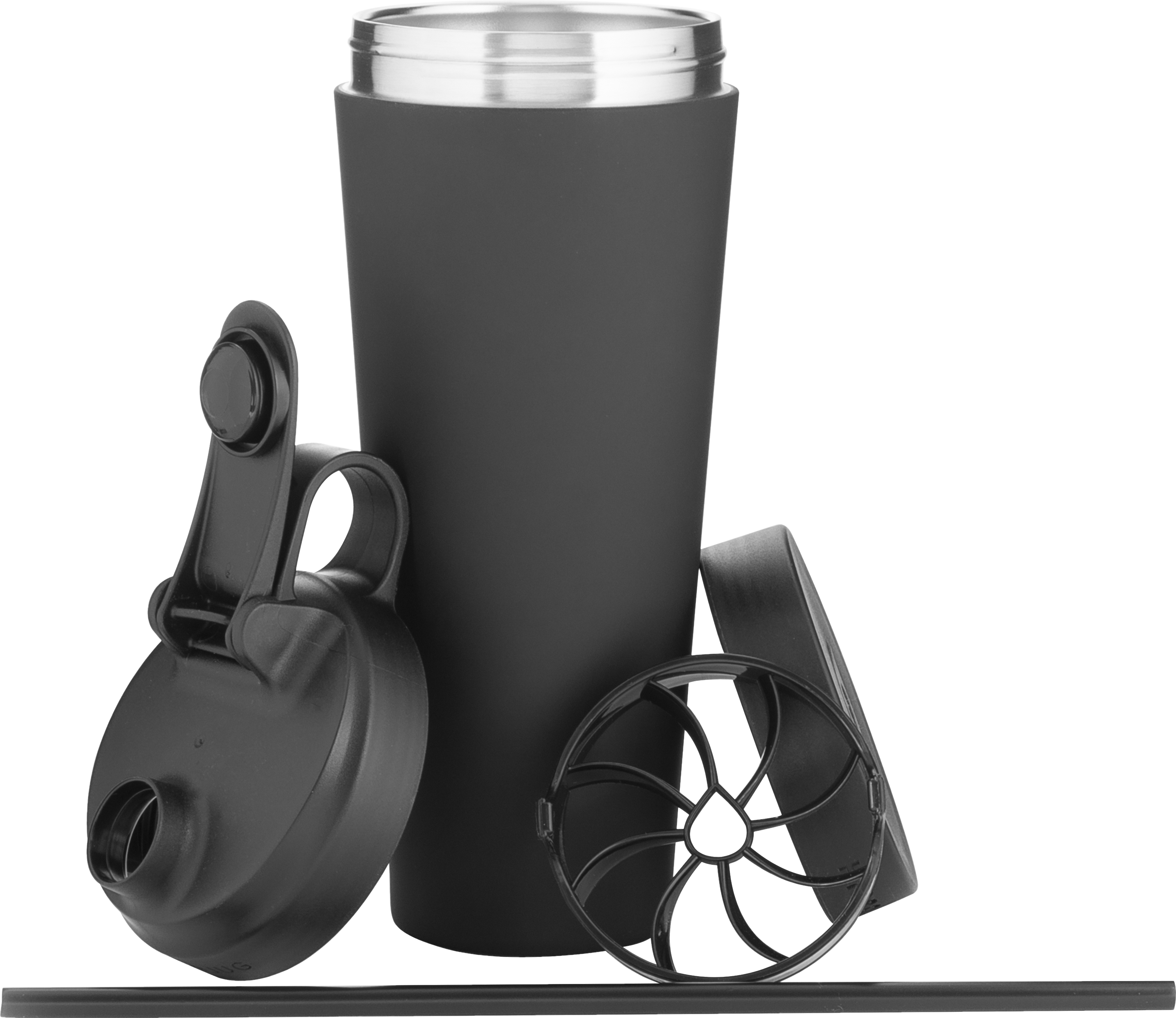 The Hydroshkr Stainless Steel 24 oz shaker bottle combines durability, insulation, and versatility in one sleek design. Made from double wall 18/8 stainless steel with copper vacuum insulation, it keeps cold beverages chilled for hours. It includes two interchangeable threaded lids—one with a snap closure and one with a strap opening—plus a straw and built-in shakr grate for smooth mixing. A silicone base pad adds stability, while the rubberized finish offers a soft-touch grip and modern look.