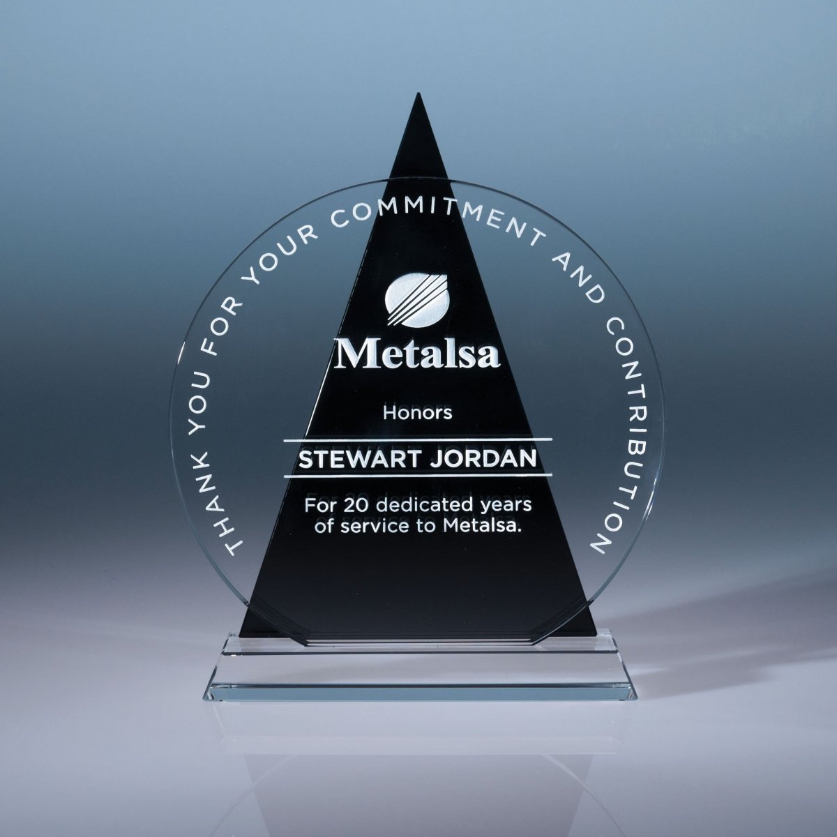 Our Icon features basic geometric shapes for a look that's contemporary while affording plenty of room for your creativity. The triangle is available in your choice of blue, red, or black creating contrast that will make your message shine from afar. All components are quality optic crystal. Secondary etching location included as shown.9"H x 7"W x 1.75"D