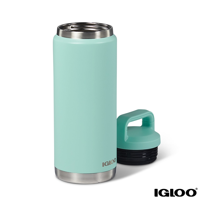 Take Igloo® 26oz. double wall stainless steel water bottle is the perfect hydration companion for the office, gym or your travel. The vacuum sealed construction with copper lining will keep your iced drinks cold for 48 hours and hot drinks hot for 12 hours. It has a wide mouth opening for easy ice loading and cleaning and its lid’s integrated carry handle with soft TPE grip makes it easy and comfortable to carry. The powder coat finish gives the bottle a nice and clean look and is also sweat proof. FDA compliant and BPA Free.
