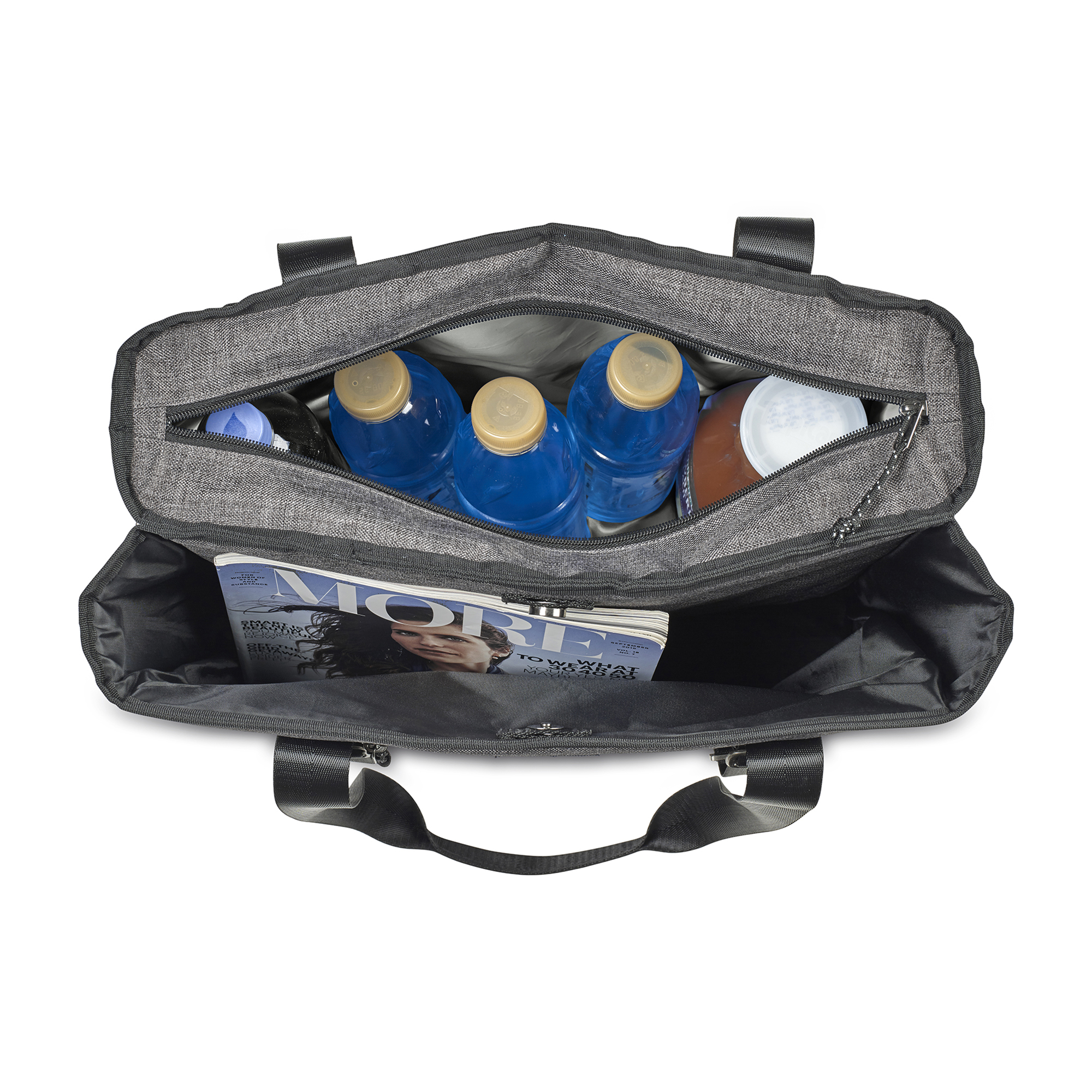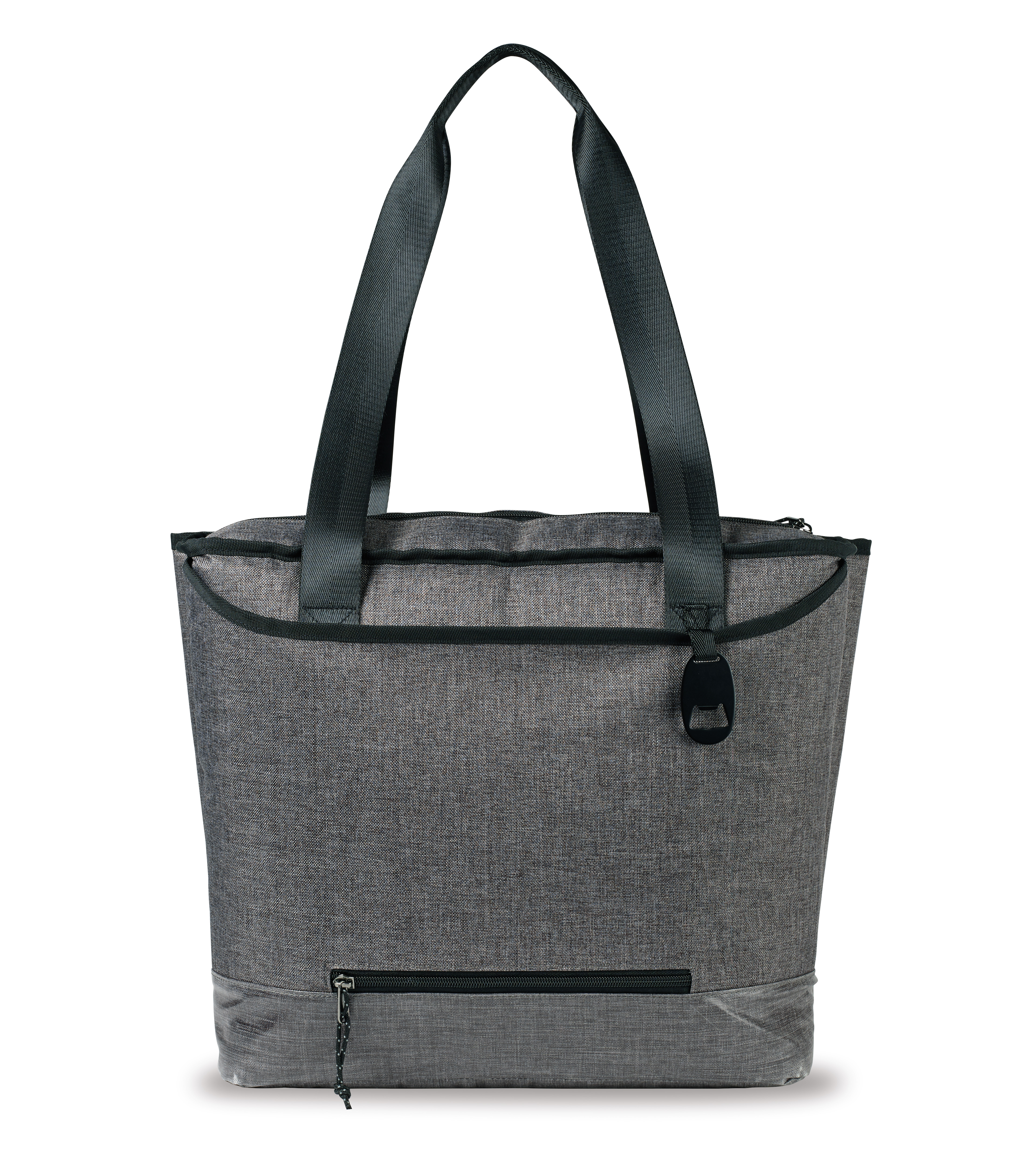 The ultimate carryall cooler. Dual compartment functionality includes both insulated and dry storage. Bottle opener conveniently attached for on-the-go use. Front straps adjust to secure blanket or towel. Trolley strap feature slips over luggage handle for easy transport. Front zippered pocket for additional storage. Dual carry handles. EPPE heat-sealed lining. PVC free. Phthalate free. 20 can capacity.