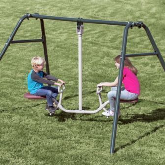 he Gym Dandy Tilt-A-Swing is a unique and fun piece of playground equipment for your home. The tilt-a-swing adds more entertainment to your backyard than a regular swing because of all the options: swing back and forth, side-to-side, and you can spin in 360 degrees!. With the tilt-a-swing, your kids can play outside for hours at a time. The tilt-a-swing is made from durable 14-gauge steel and thick plastic to ensure the safety of your children. Soft foam covered handles and foot rests offer your child an easy way to secure themselves to their seat.
